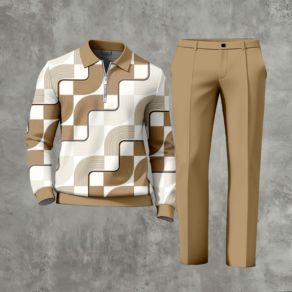 Men's Casual Khaki & White Color Matching Geometric Retro Print Polo-Collar Zipper Long Sleeve Pants Two-Piece Set