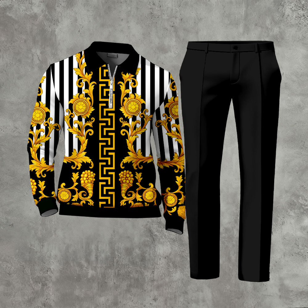 Men's Casual Gold Flower Retro Black & White Striped Print Polo-Collar Zipper Long Sleeve Pants Two-Piece Set