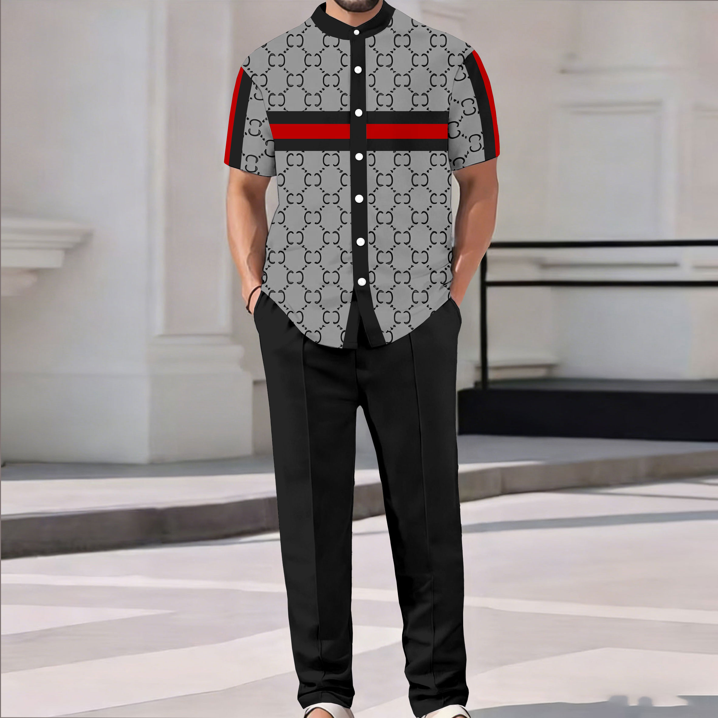 Men's Casual Gray & Black Color Matching Vintage Printed Short Sleeved Shirt & Trousers Two-Piece Set