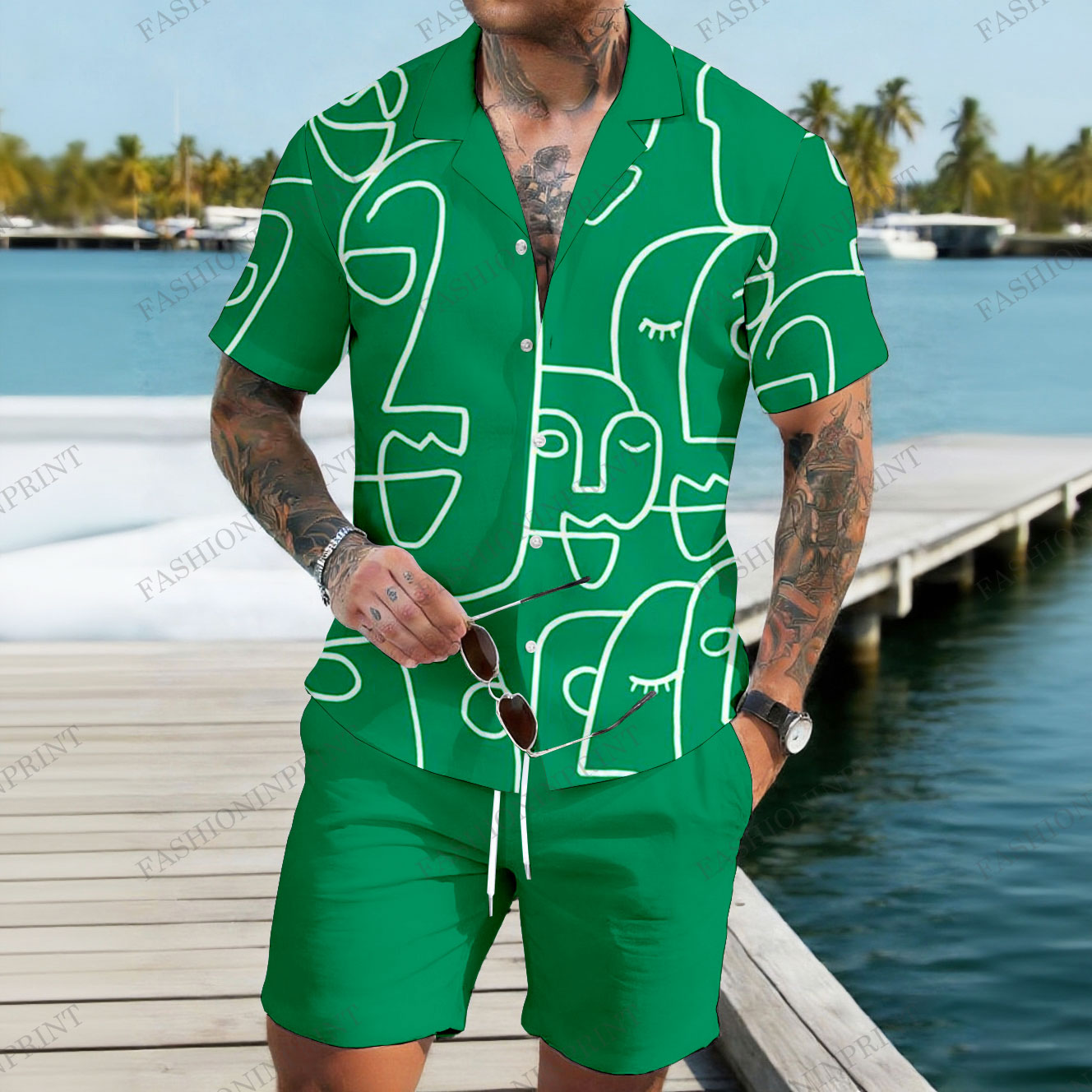 Men's Casual Green Color Matching Hawaii Print Short-Sleeve Shirt & Shorts Two-Piece Set