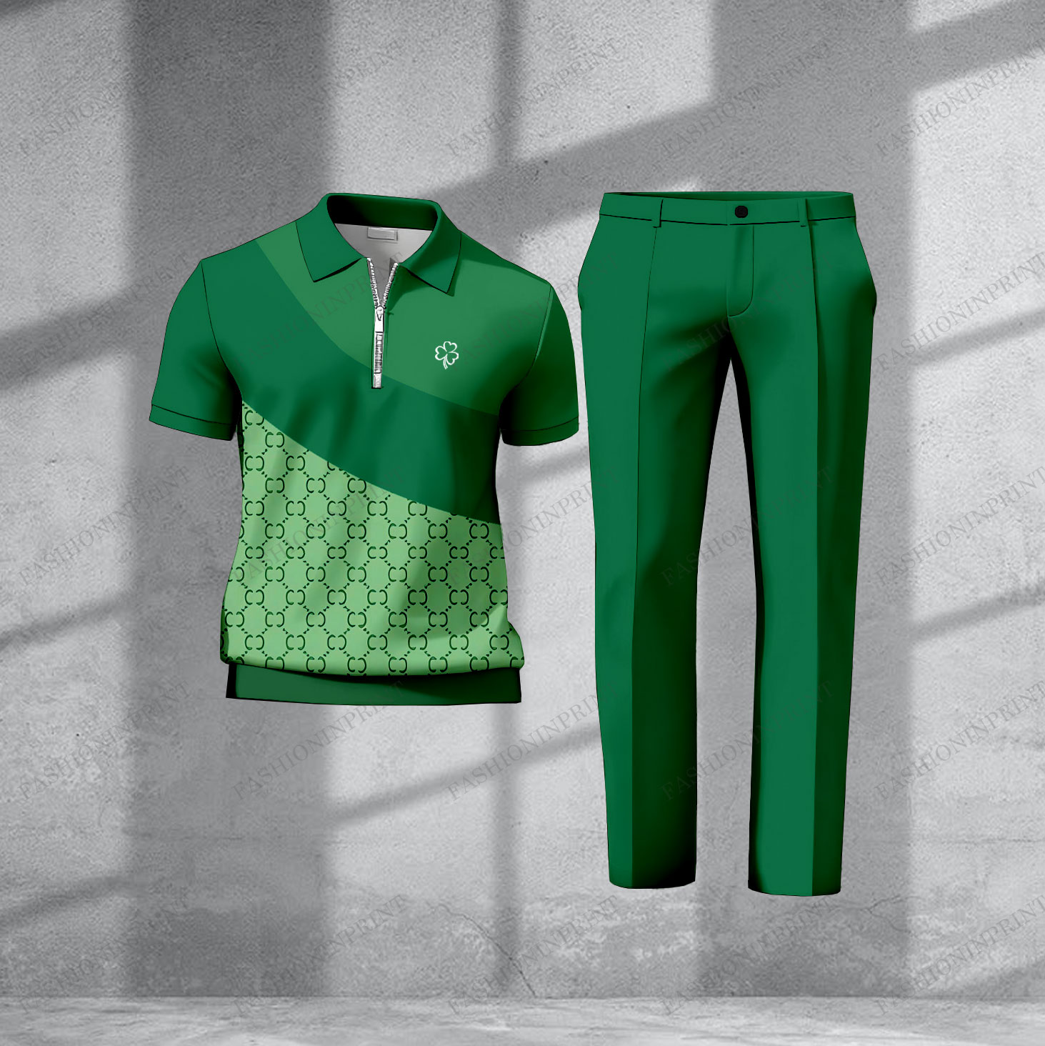 St. Patrick's Day Men's Casual Green Color Matching Retro Style Printed Short Sleeved Polo Shirt & Trousers Two-Piece Set