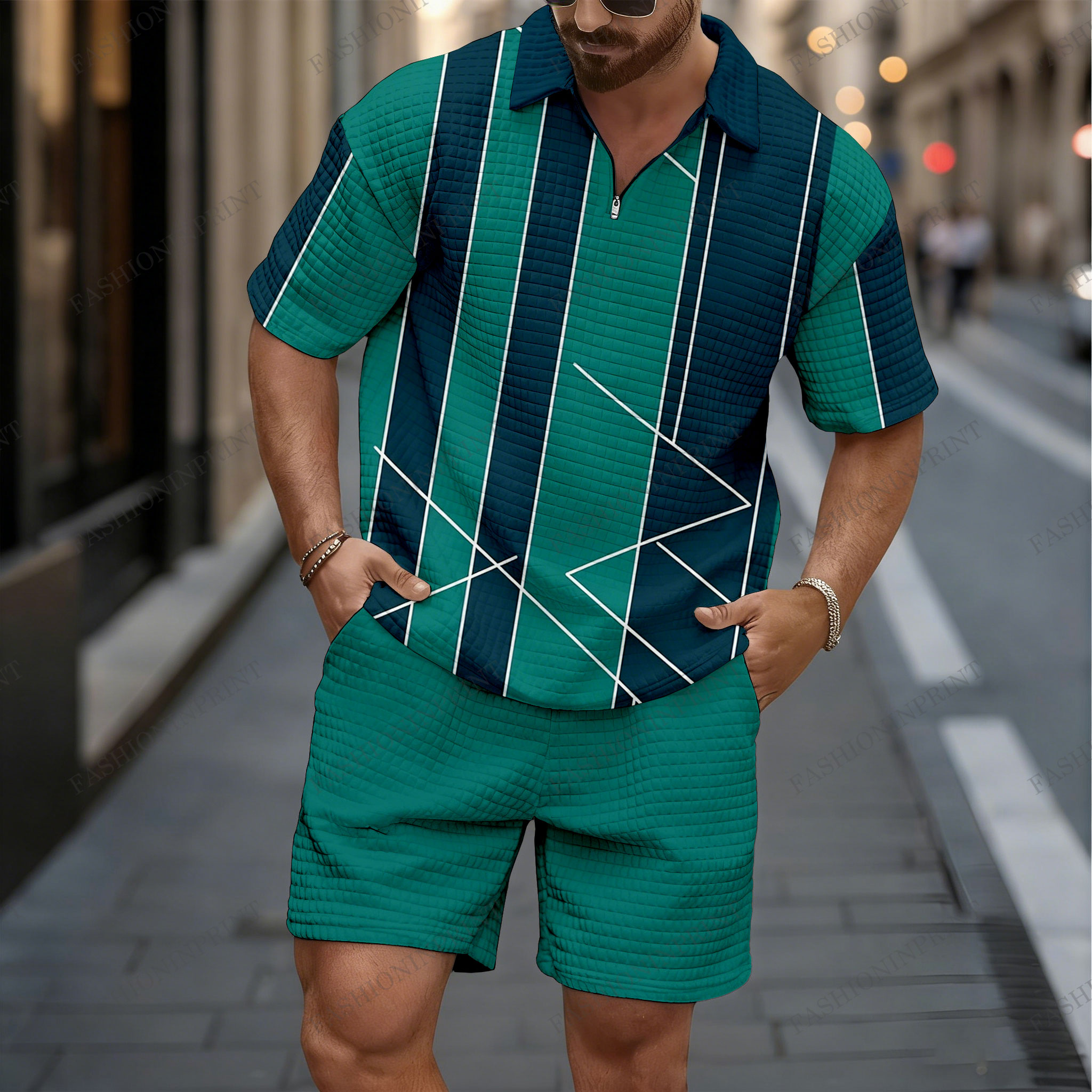 Men's Casual Green & Navy Blue Geometric Patterns Half-Zip Short-Sleeved Shirt And Shorts Two-Piece Set