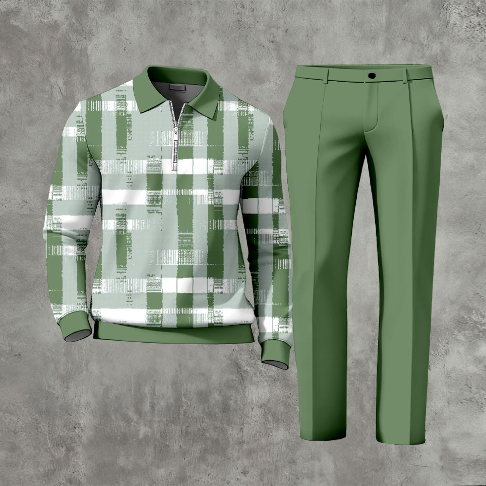 Men's Casual Green & White Color Matching Geometric Pattenr Polo-Collar Zipper Long Sleeved Trousers Two-Piece Set
