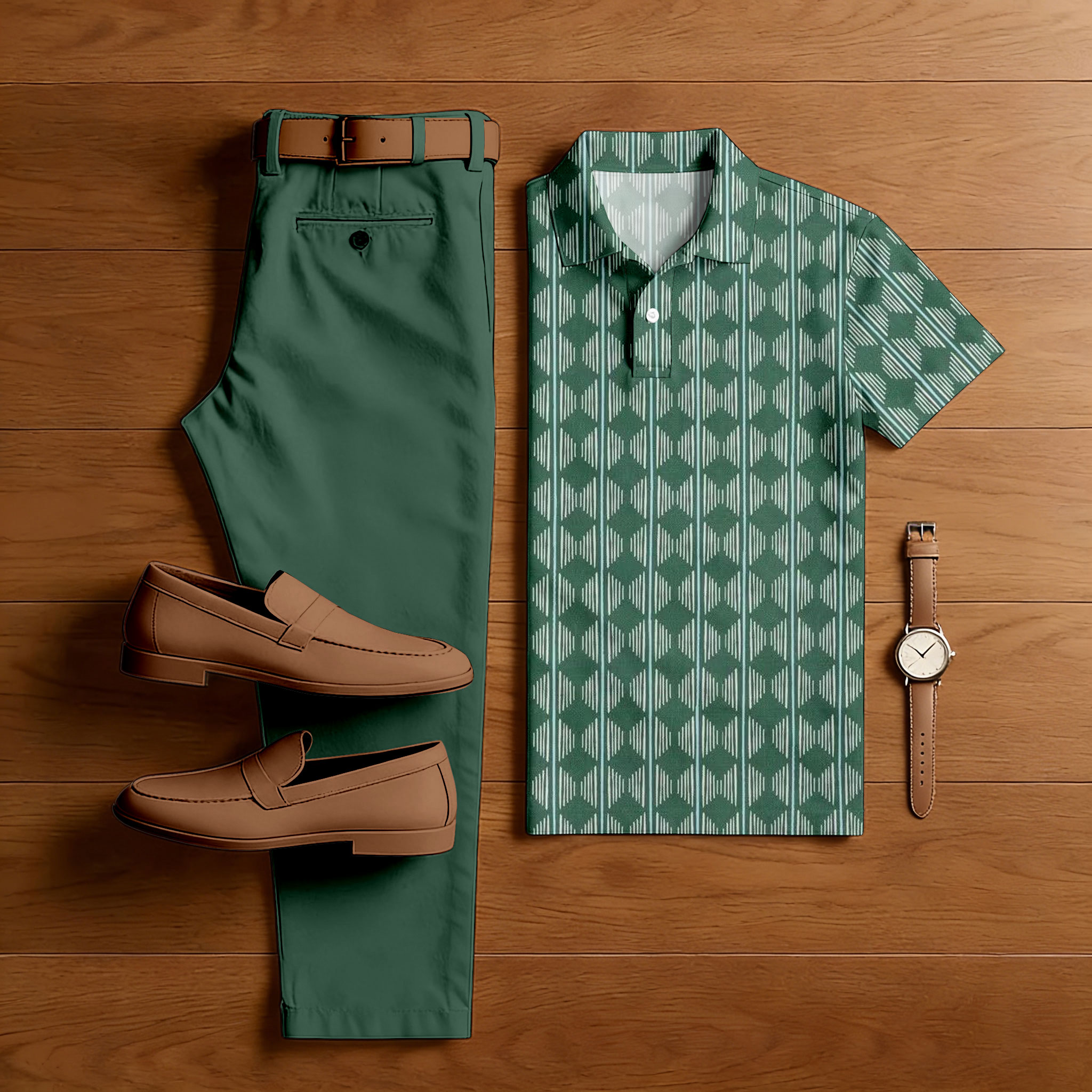 Men's Casual Green & White Color Matching Retro Style Printed Short Sleeved Polo Shirt & Trousers Two-Piece Set