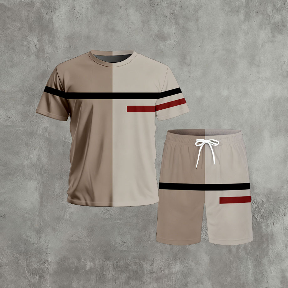 Men's Casual Khaki & Coffee Color Matching Striped Printed Round Neck Short Sleeved & Shorts Two-Piece Set