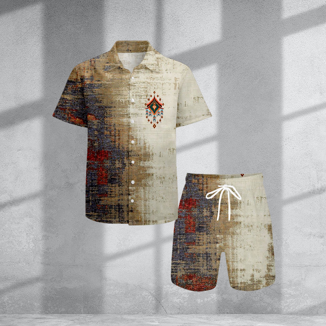 Men's Casual Khaki Gradien Vintage Pattern Short-Sleeve Shirt & Shorts Two-Piece Set