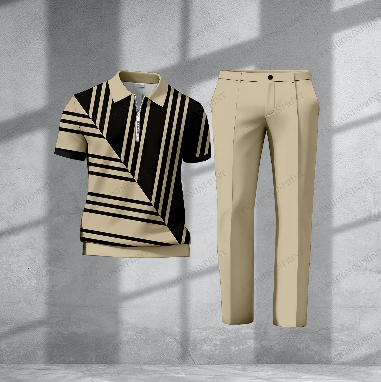 Men's Casual Khaki Green & Black Color Matching Geometric Printed Short Sleeved Polo Shirt & Trousers Two-Piece Set