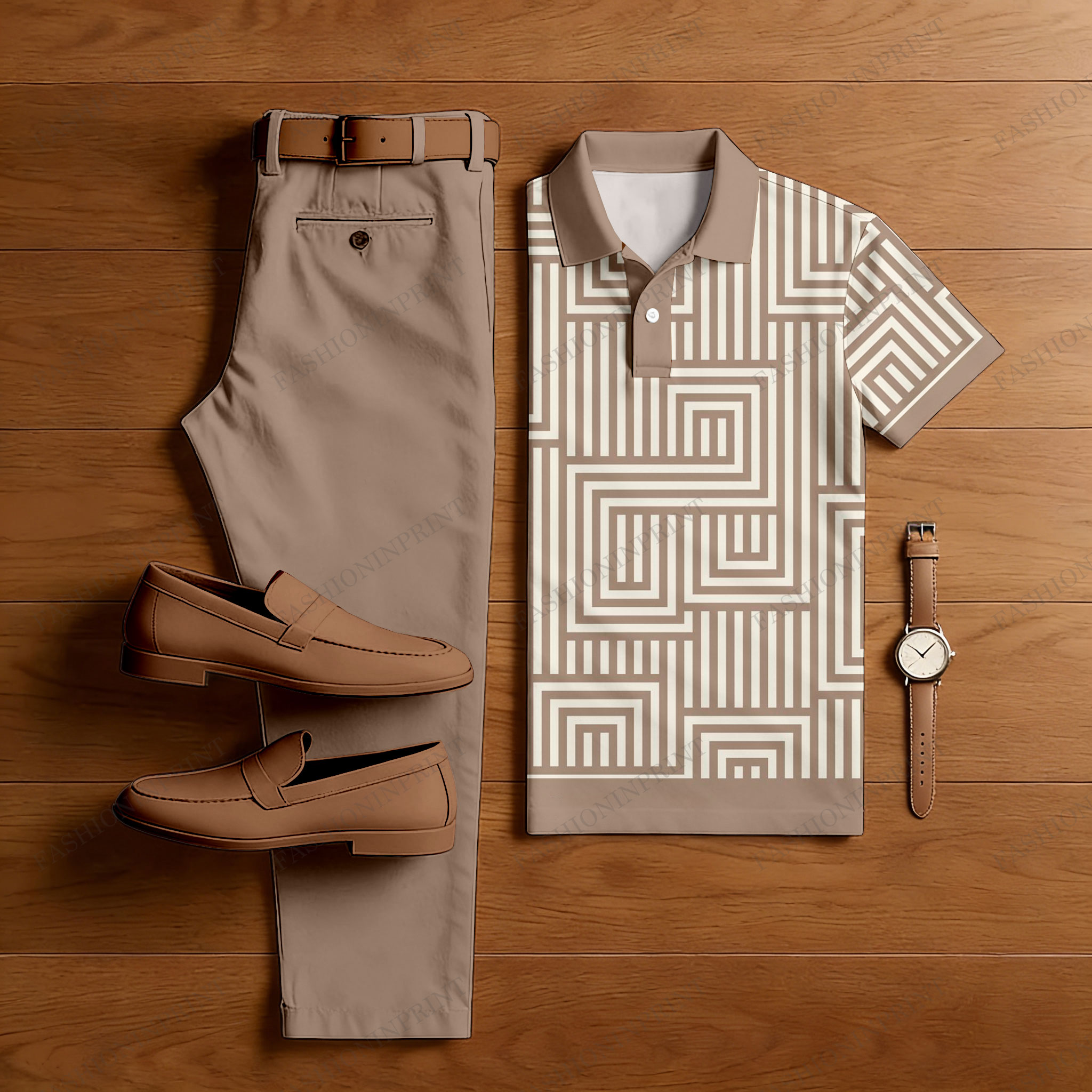Men's Casual Light Brown & Beige Color Matching Checkered Printed Short Sleeved Polo Shirt & Trousers Two-Piece Set