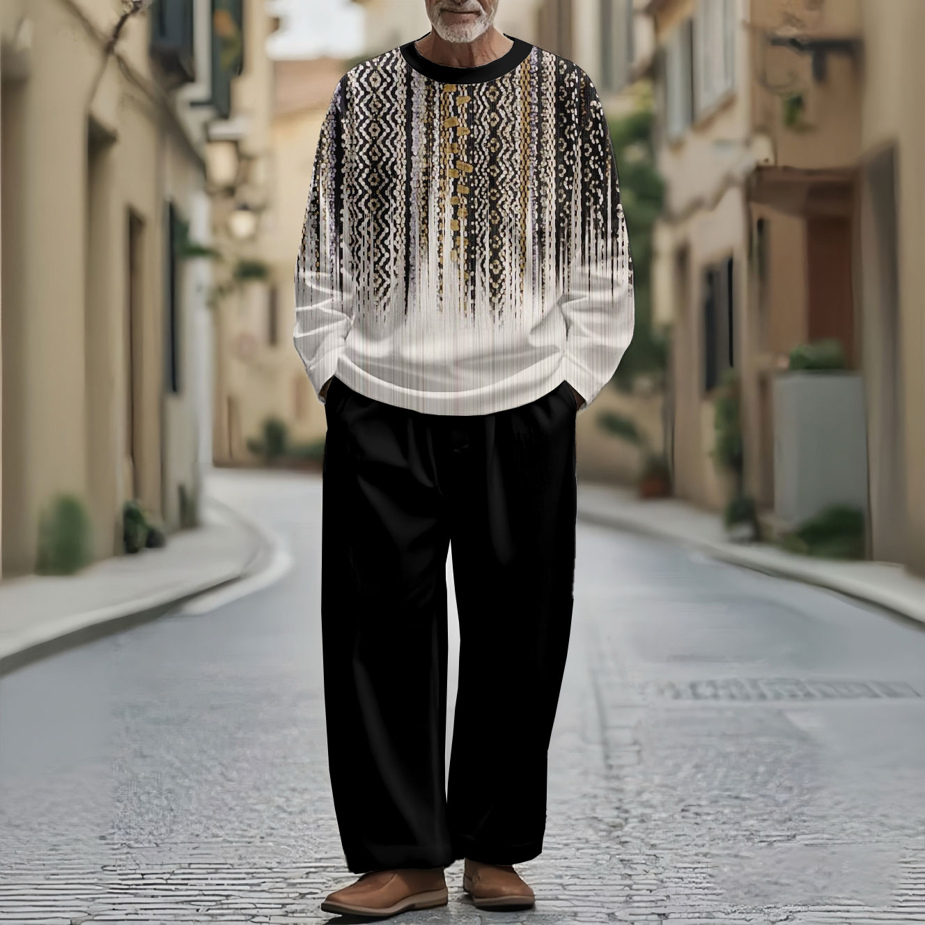 Men's Casual Loose Round-Neck Color Matching Striped Printed Long-Sleeved T-Shirt & Trousers Two-Piece Set