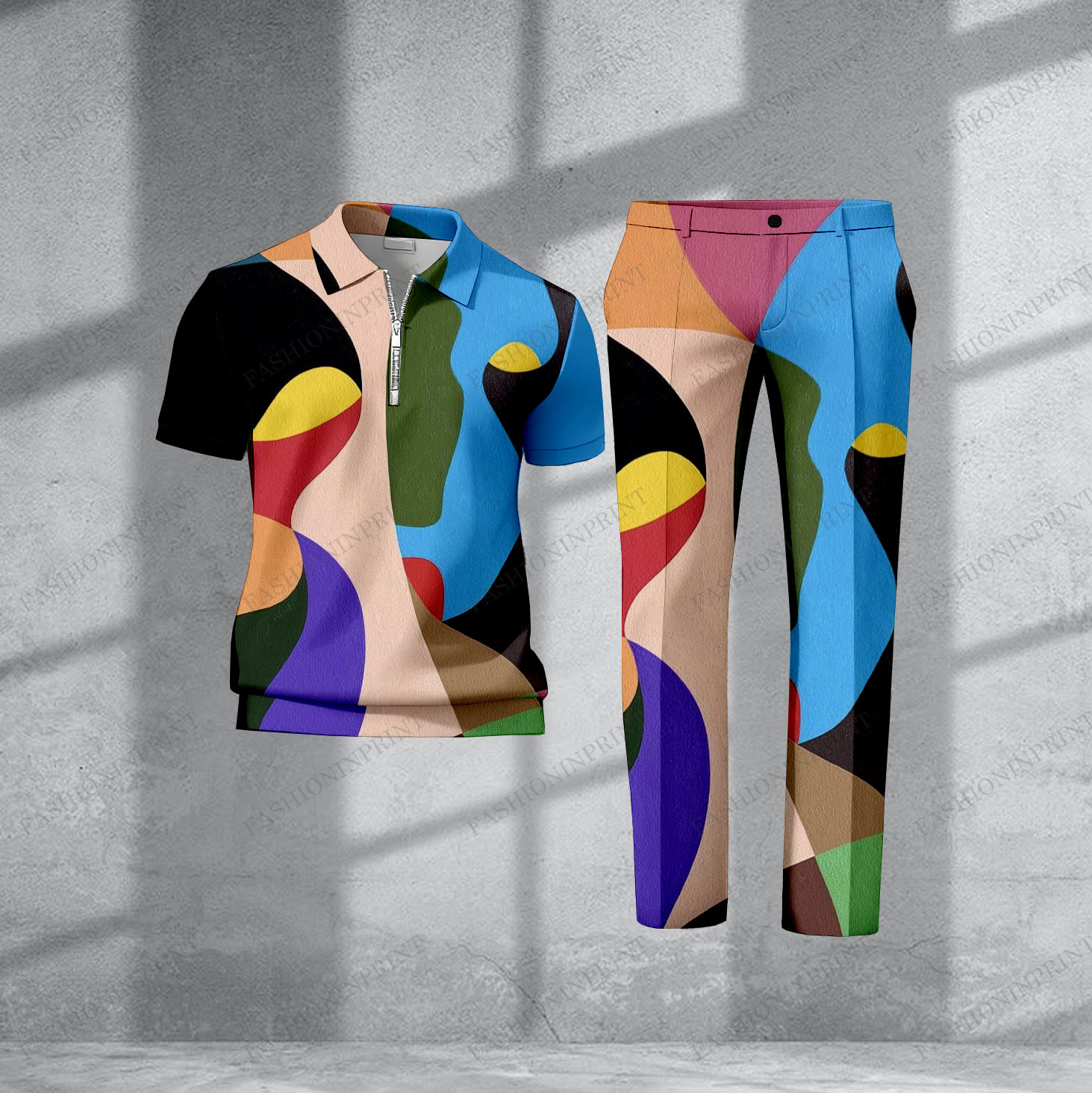 Men's Casual Multi Color Matching Geometric Printed Short Sleeved Polo Shirt & Trousers Two-Piece Set