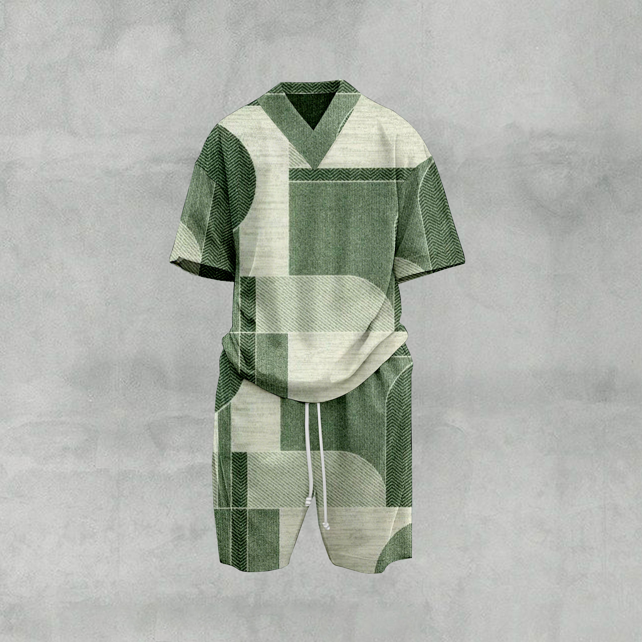 Men's Casual Multi Green Color Matching Geometric Printed V-Neck Short Sleeved T-Shirt & Six Point Shorts Two-Piece Set