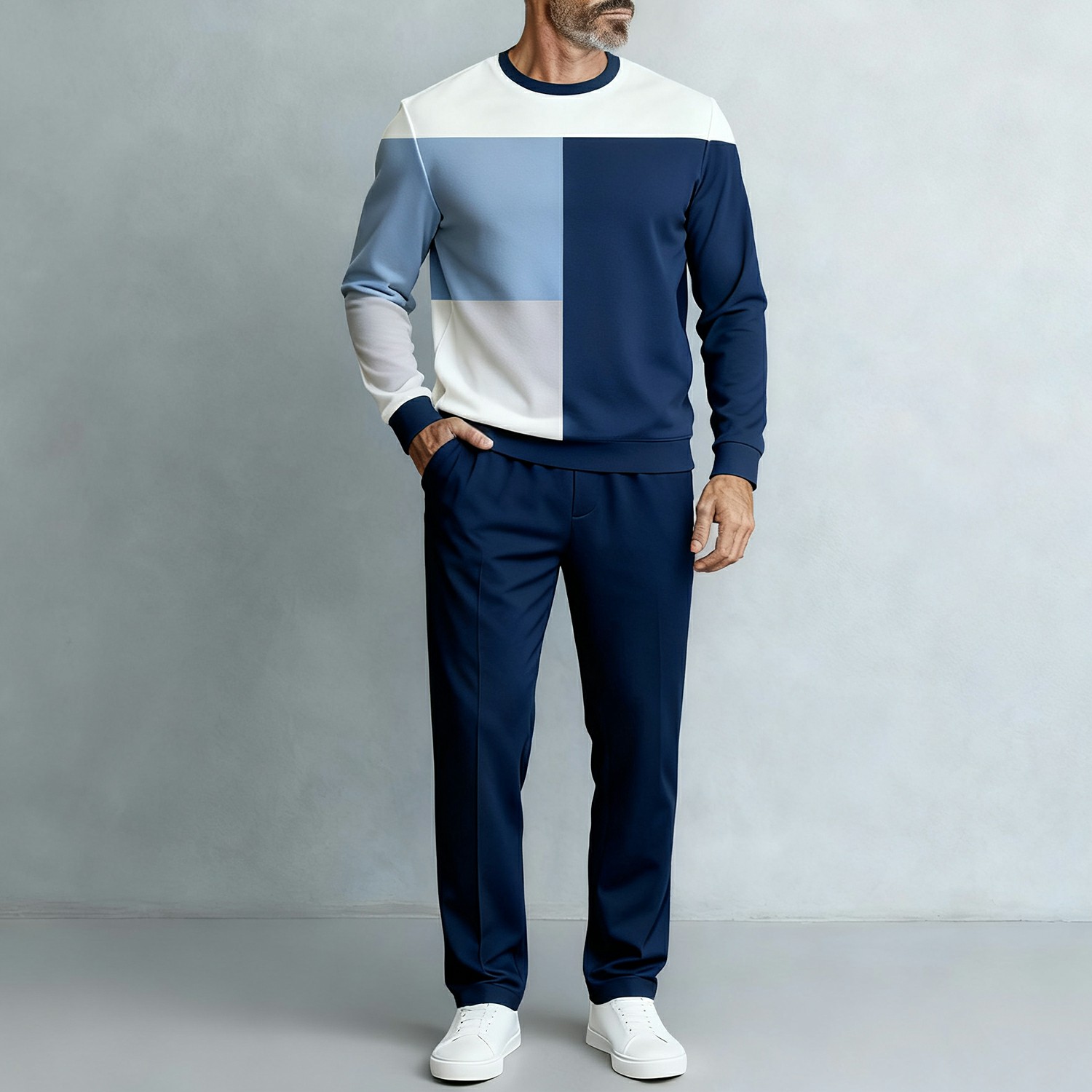 Men's Casual Navy Blue Color Matching Asymmetric Printed Round-Neck Long Sleeved Trousers Two-Piece Set