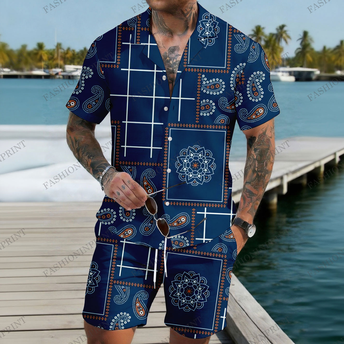 Men's Casual Navy Blue Color Matching Ethnic Style Print Short-Sleeve Shirt & Shorts Two-Piece Set