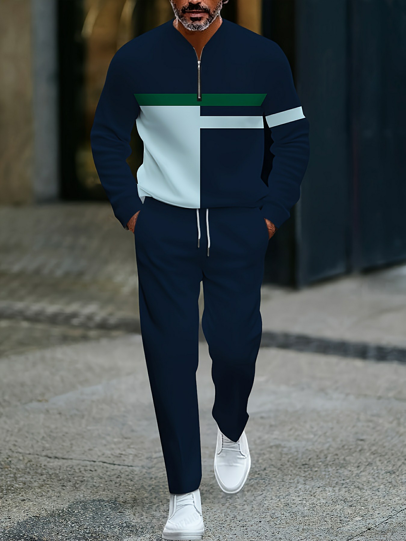 Men's Casual Navy Blue Color Matching Geometric Printed Round-Neck Zipper Long Sleeved Trousers Two-Piece Set