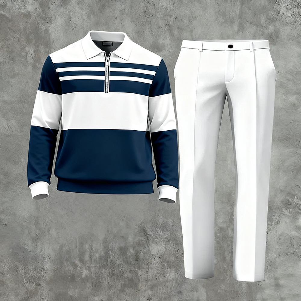 Men's Casual Navy Blue Color Matching Striped Printed Polo-Collar Zipper Long Sleeved Trousers Two-Piece Set