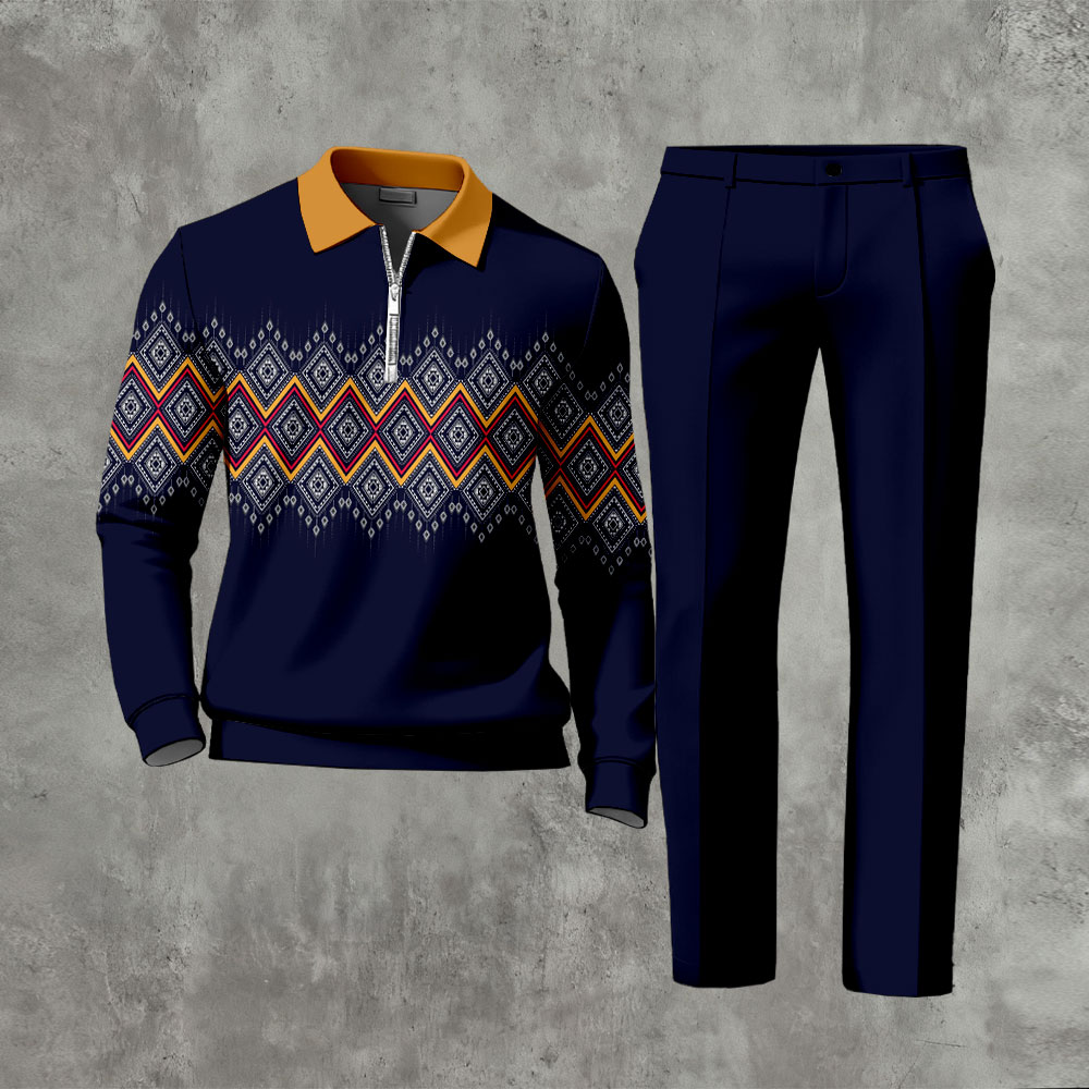 Men's Casual Navy Blue & Orange Color Matching Vintage Flower Printed Polo-Collar Zipper Long Sleeved Trousers Two-Piece Set