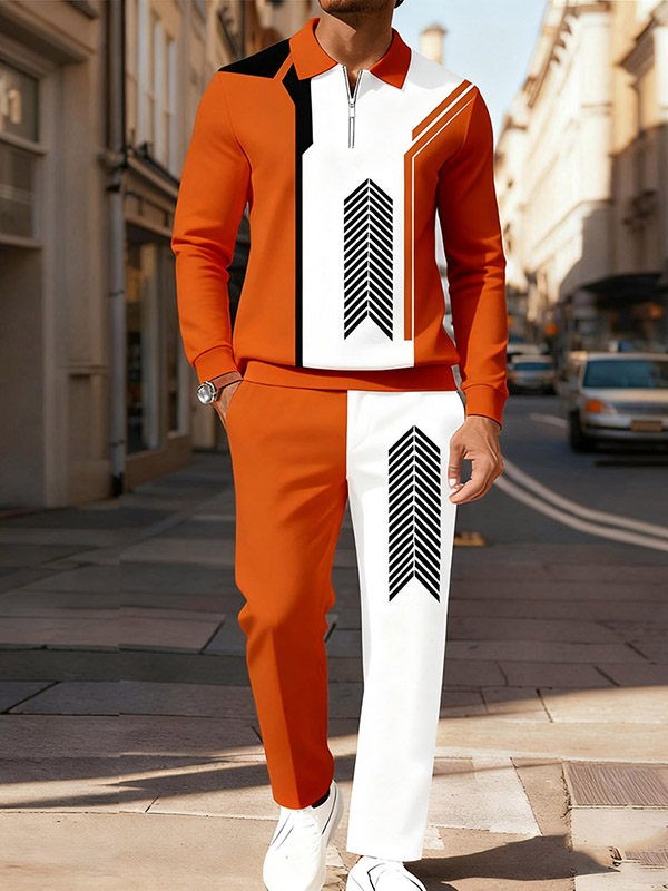 Men's Casual Orange&White Color Matching Printed Polo-Collar Zipper Long Sleeved Trousers Two-Piece Set