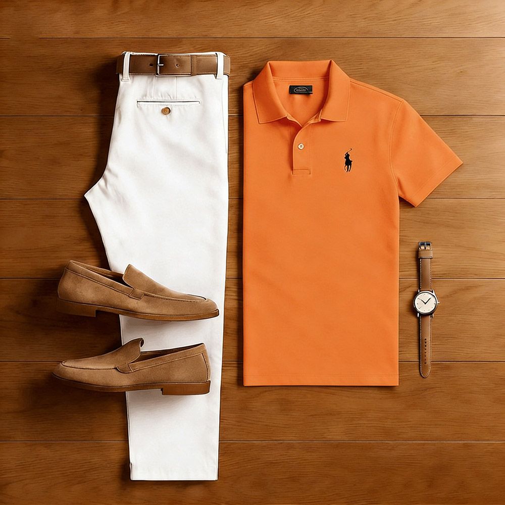 Men's Casual Orange & White Solid Color Matching Sport Short Sleeved Polo Shirt & Trousers Two-Piece Set