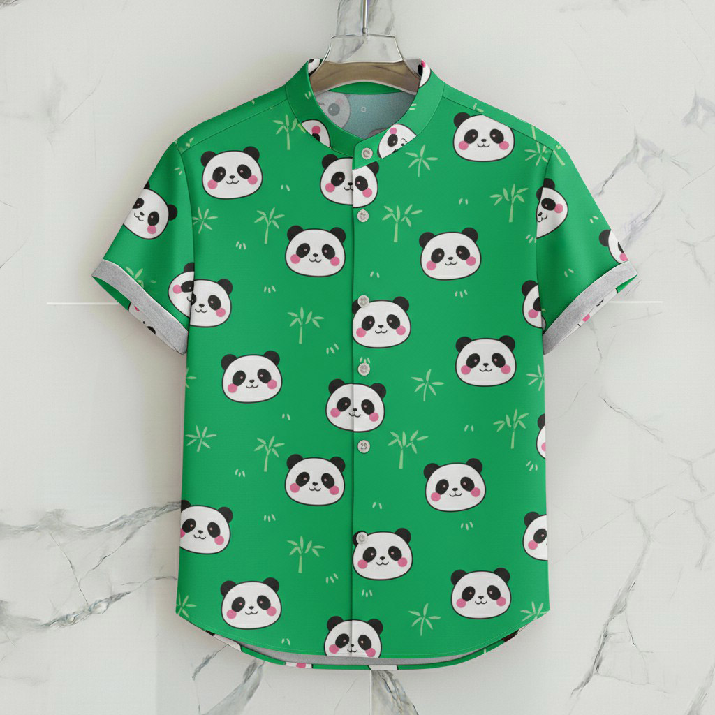 Men's Casual Green & Panda Pattern Shirt Collar Single Breasted Short Sleeve Shirts