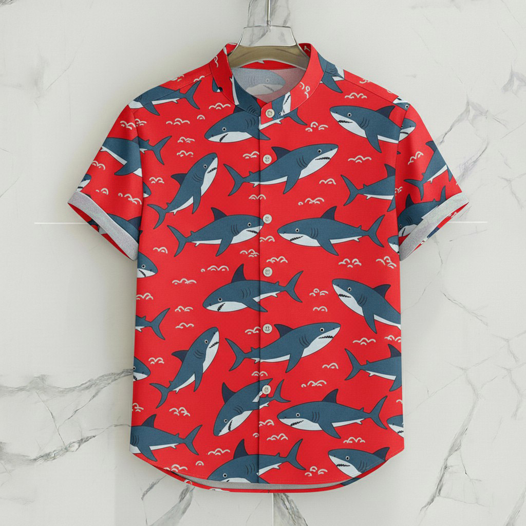 Men's Casual Red & Shark Pattern Paisley Shirt Collar Single Breasted Short Sleeve Shirts