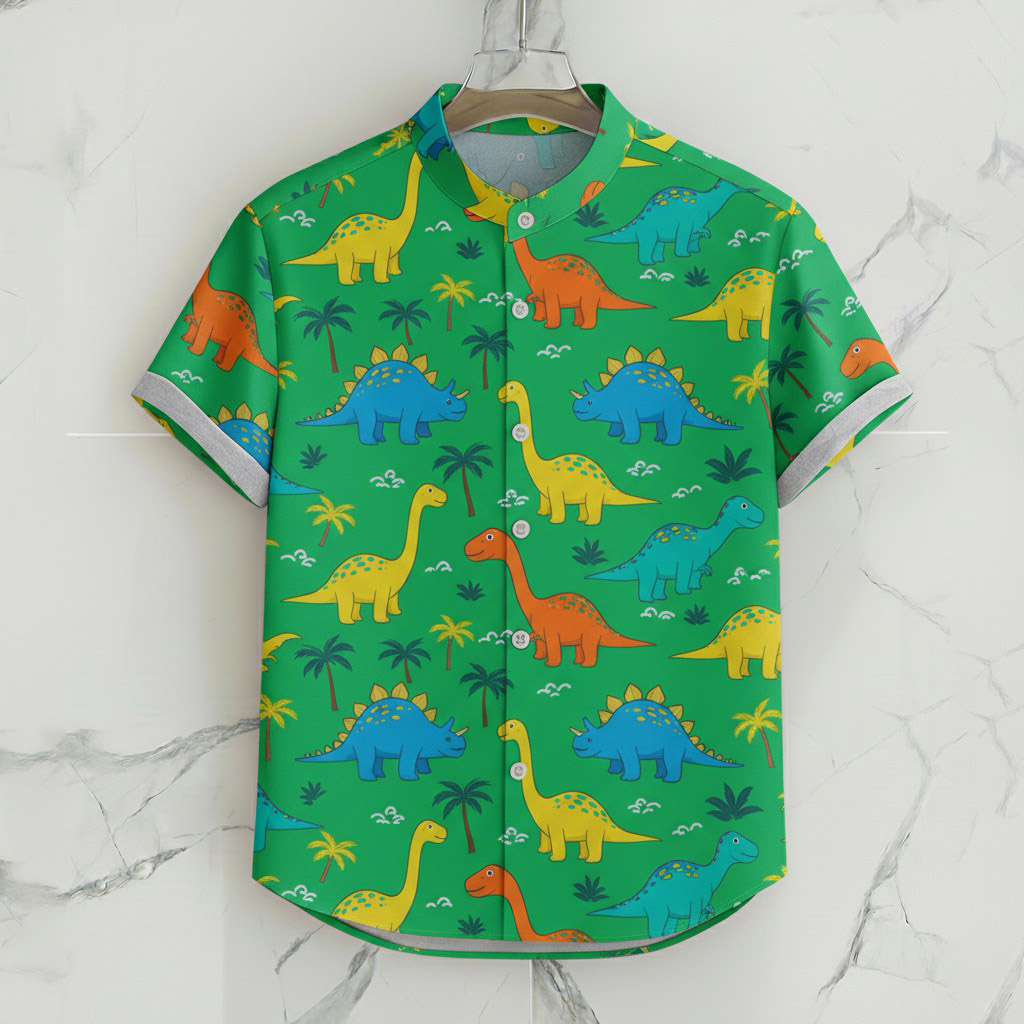 Men's Casual Green Childlike Dinosaur Pattern Shirt Collar Single Breasted Short Sleeve Shirts