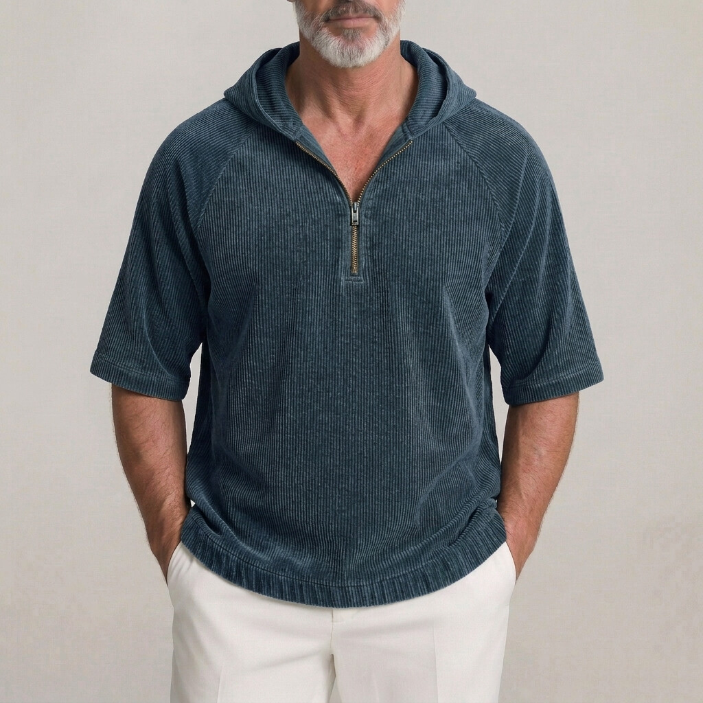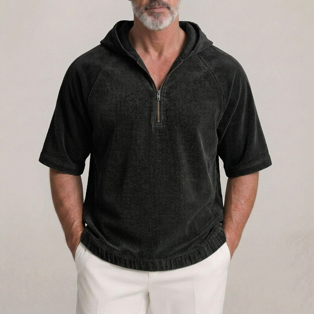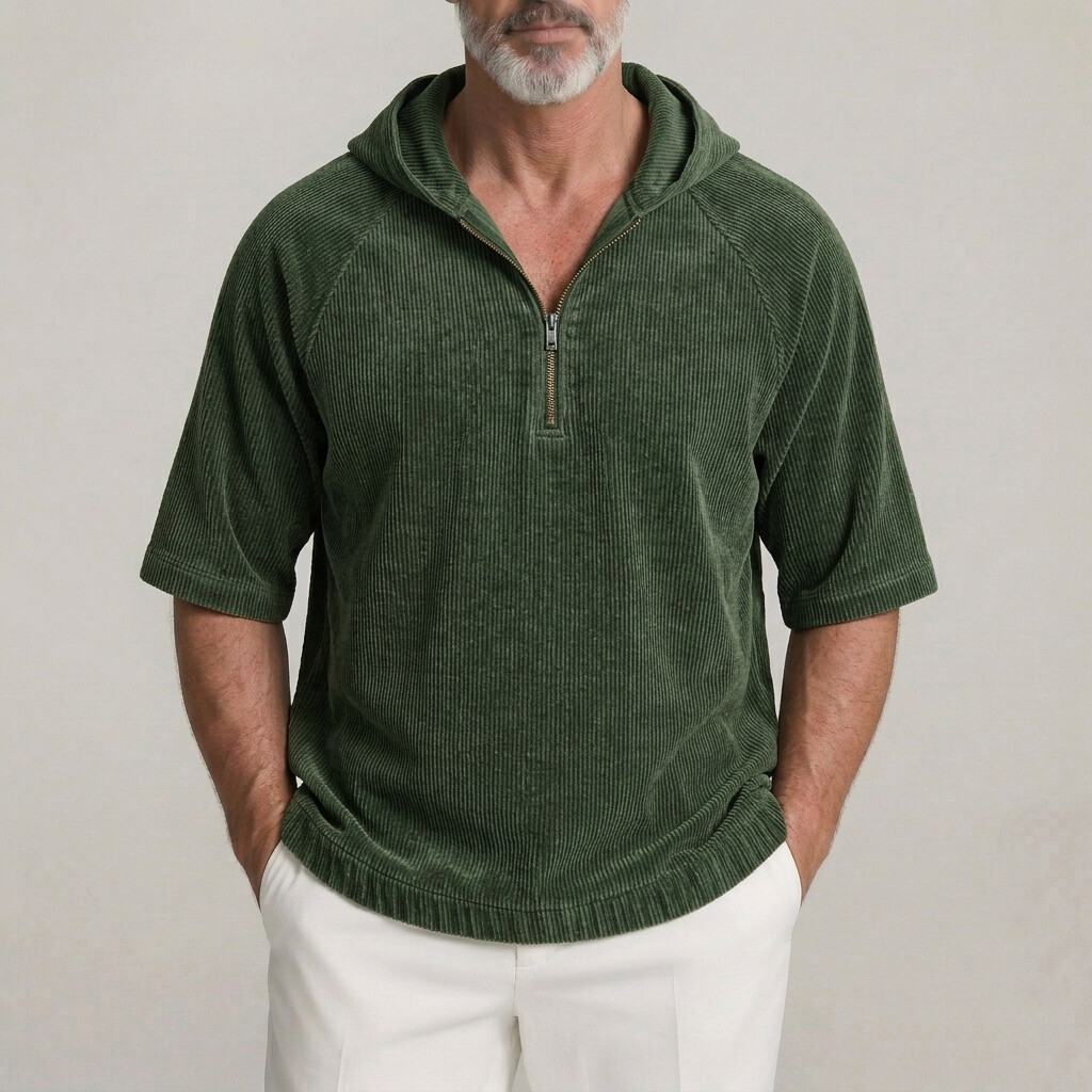 Men's Casual Plain Corduroy Half-Zip Raglan Short Sleeve Hoodie