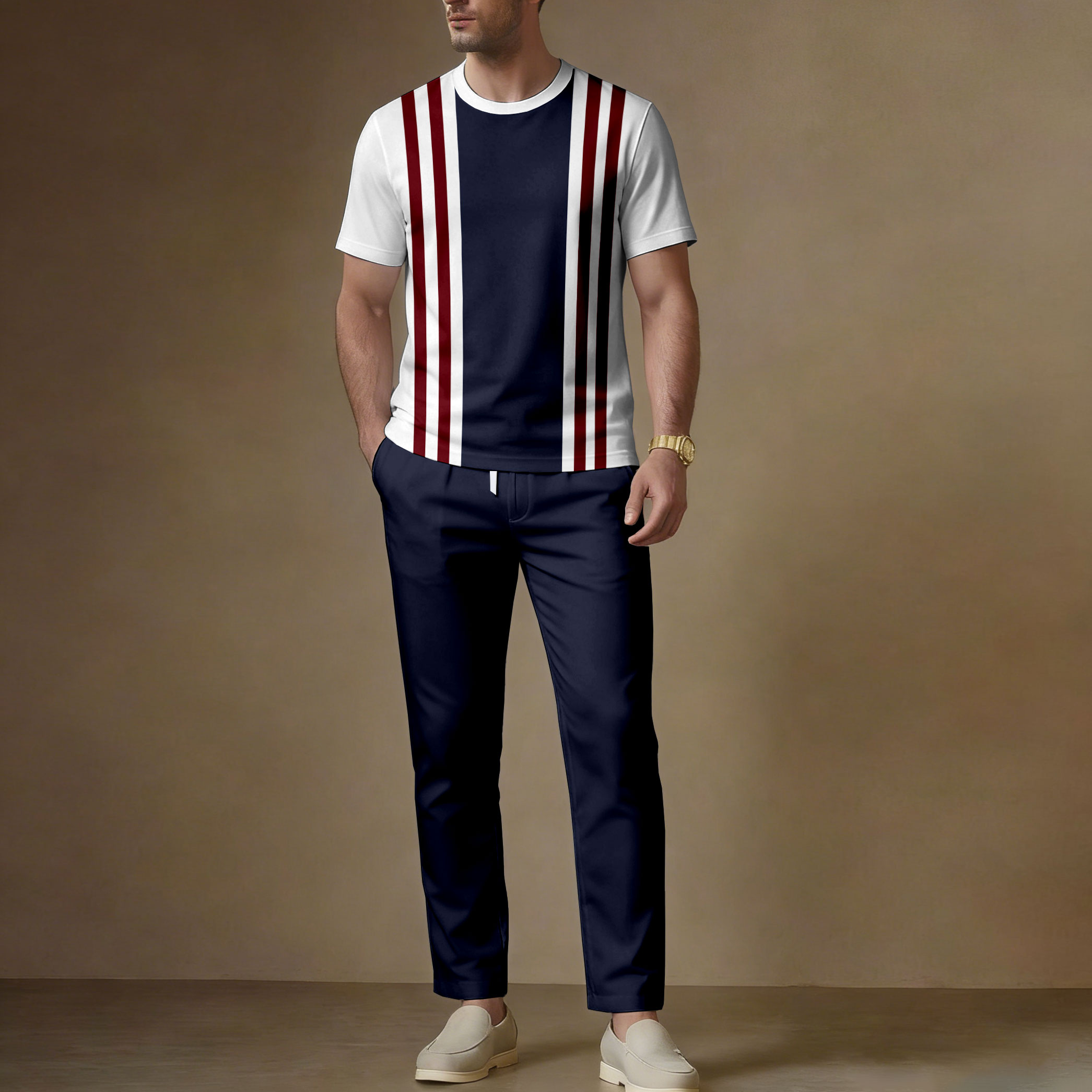Men's Casual White & Navy Blue Vertical Stripes Printed Crew Neck Short-Sleeve T-Shirt And Trousers Two-Piece Set