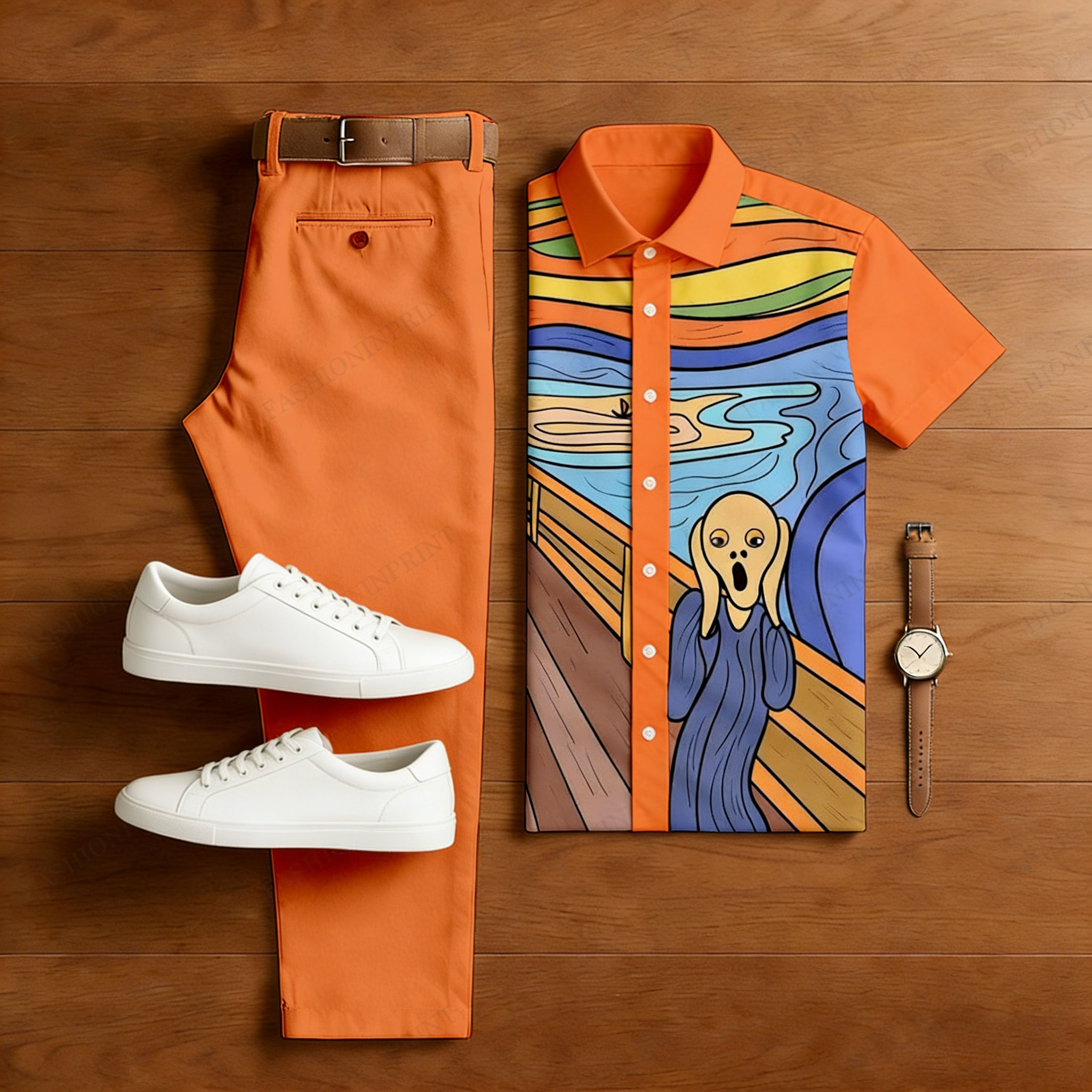 Men's Casual Orange Monk Printed Polo Shirt And Trousers Two-Piece Set