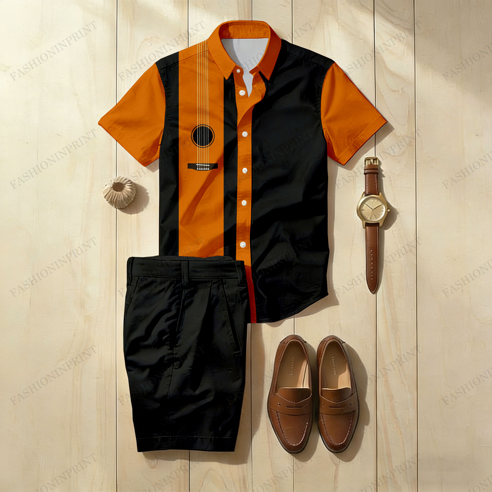 Men's Casual Black & Orange Getar Printed Short-Sleeve Shirt And Shorts Two-Piece Set