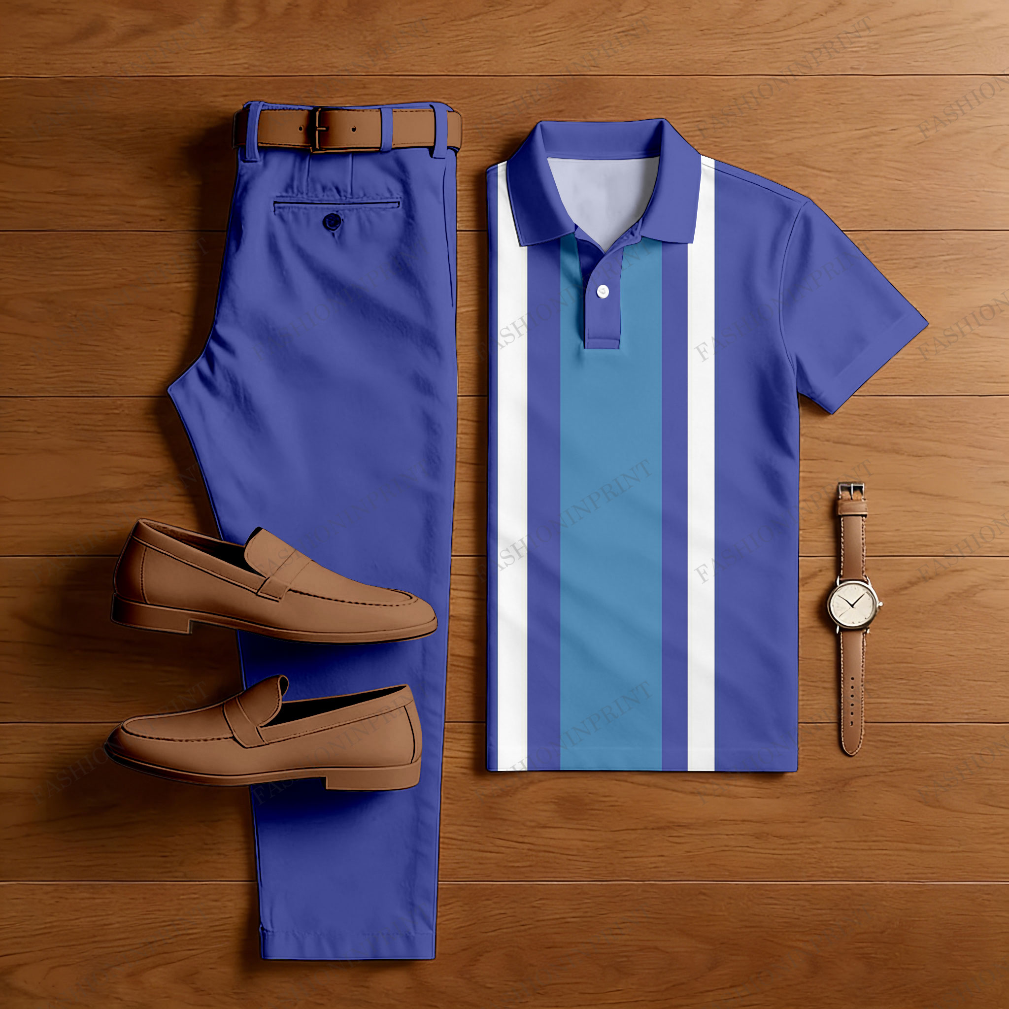 Men's Casual Purple & Blue Color Matching Striped Printed Short Sleeved Polo Shirt & Trousers Two-Piece Set