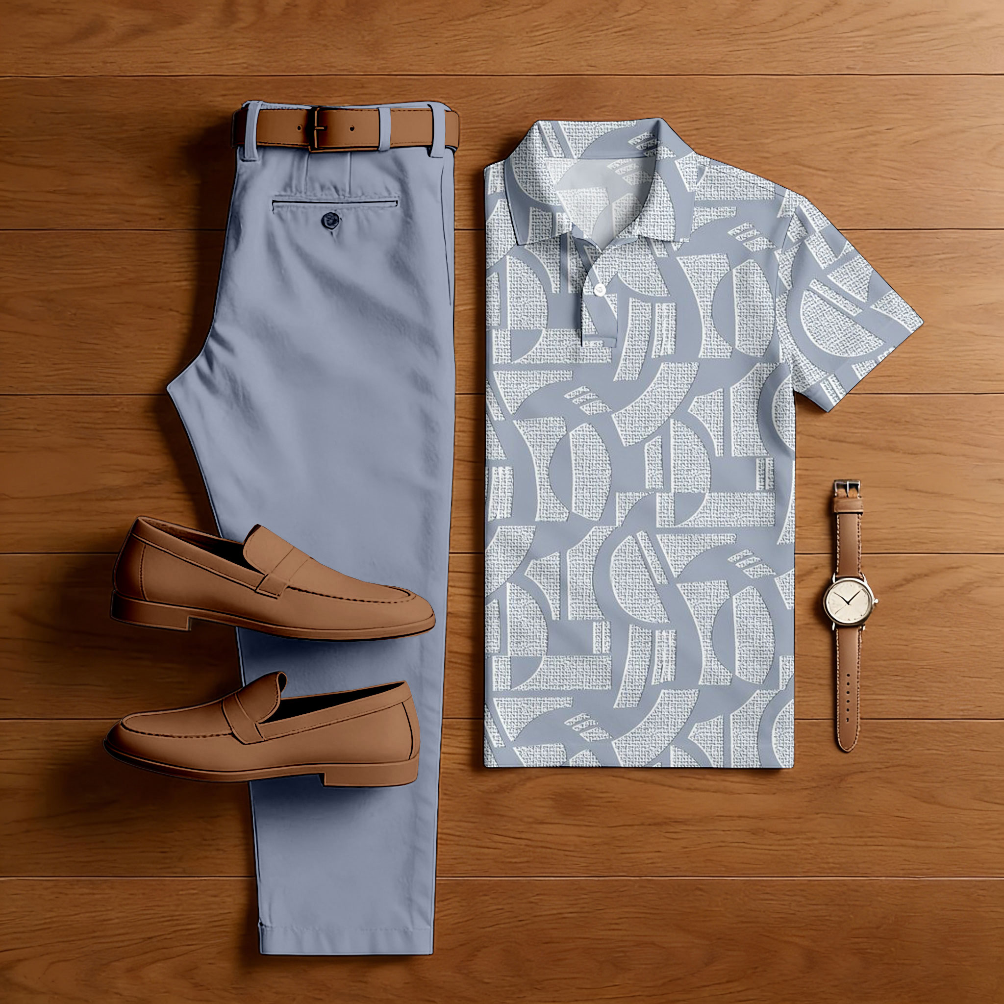 Men's Casual Purple & White Color Matching Geometric Printed Short Sleeved Polo Shirt & Trousers Two-Piece Set