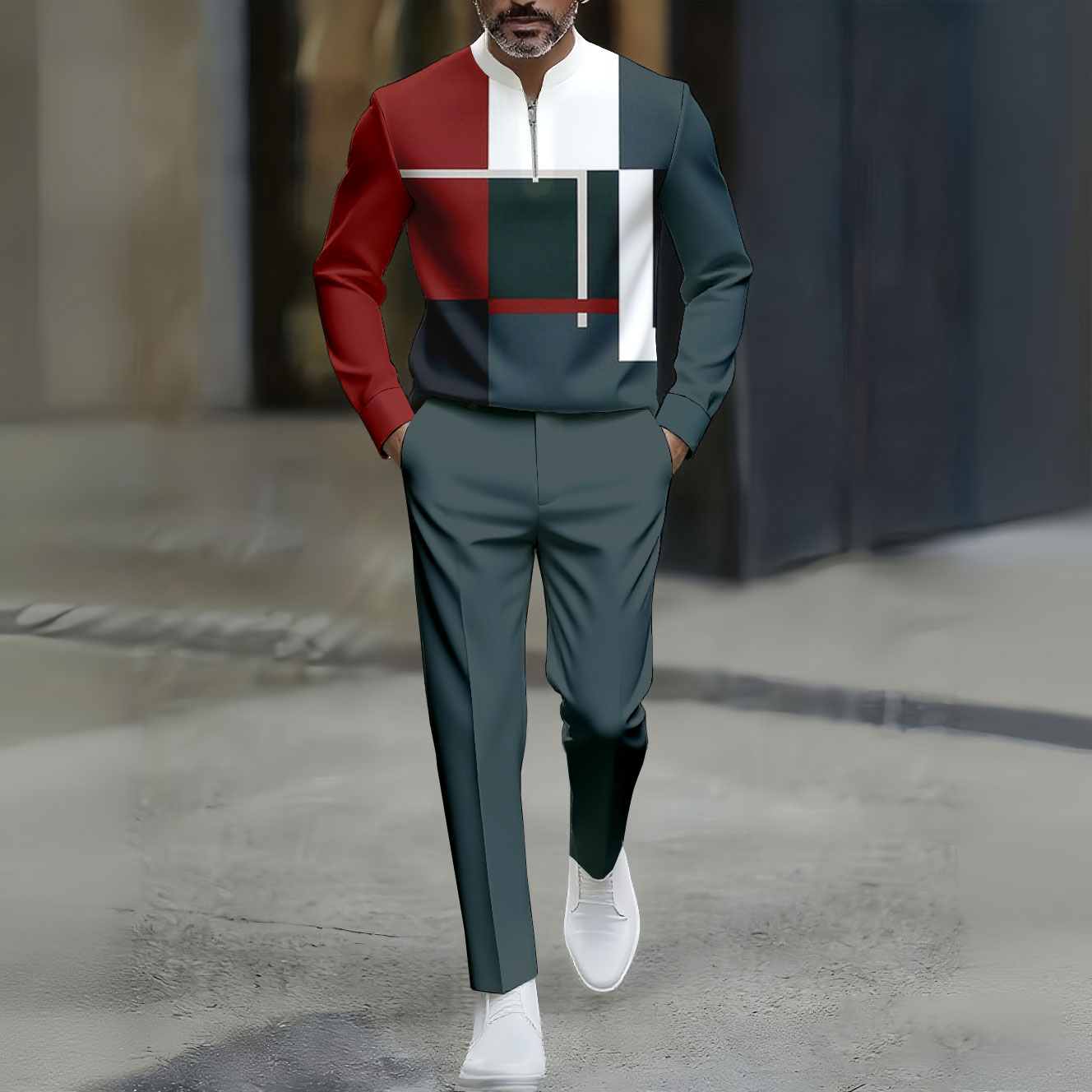 Men's Casual Red & Green Color Matching Asymmetric Checked Printed Round-Neck Zipper Long Sleeved Trousers Two-Piece Set