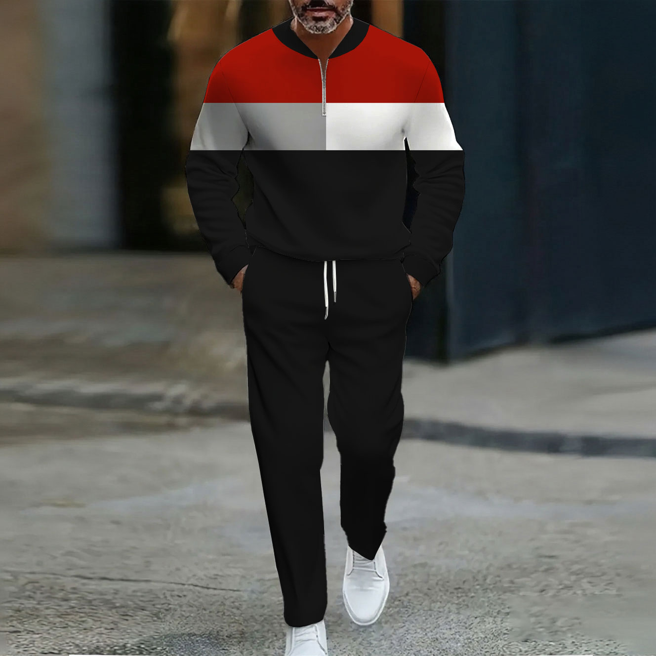 Men's Casual Black & Red Geometric Striped Printed Round Neck Zipper Long-Sleeve Sweatshirt & Pants Two-Piece Set