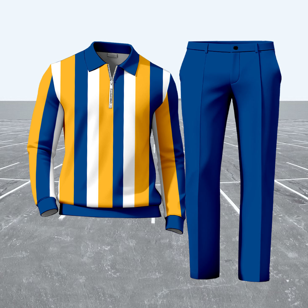 Men's Casual Royal Blue & Orange & White Color Matching Striped Printed Zipper Long Sleeved Polo Shirt & Trousers Two-Piece Set