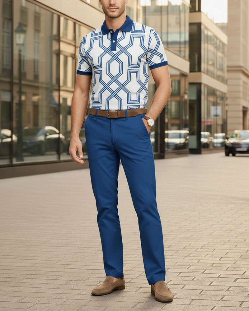 Men's Casual Royal Blue & White Color Matching Retro Flower Printed Short Sleeved Polo Shirt & Trousers Two-Piece Set