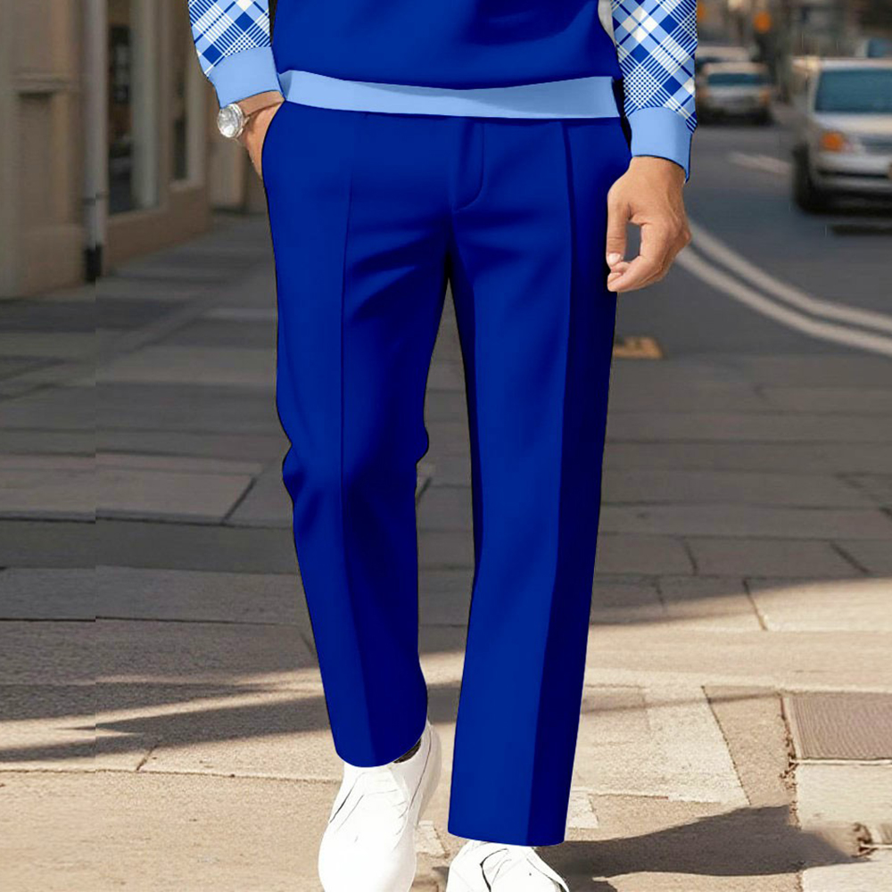 Men's Casual Royal Color Matching Checked Printed Polo-Collar Zipper Long Sleeved Trousers Two-Piece Set