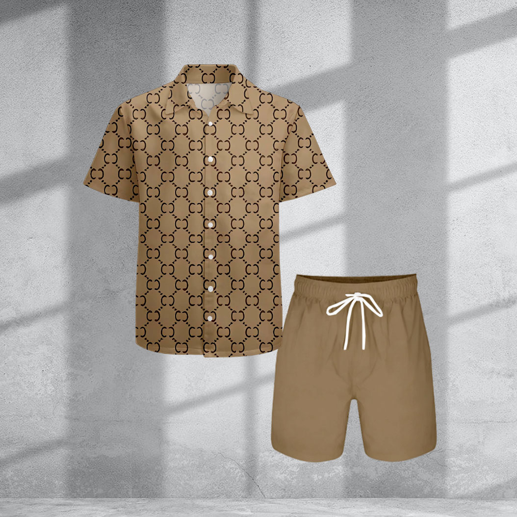Men's Casual Tan Vintage Pattern Short-Sleeve Shirt & Shorts Two-Piece Set