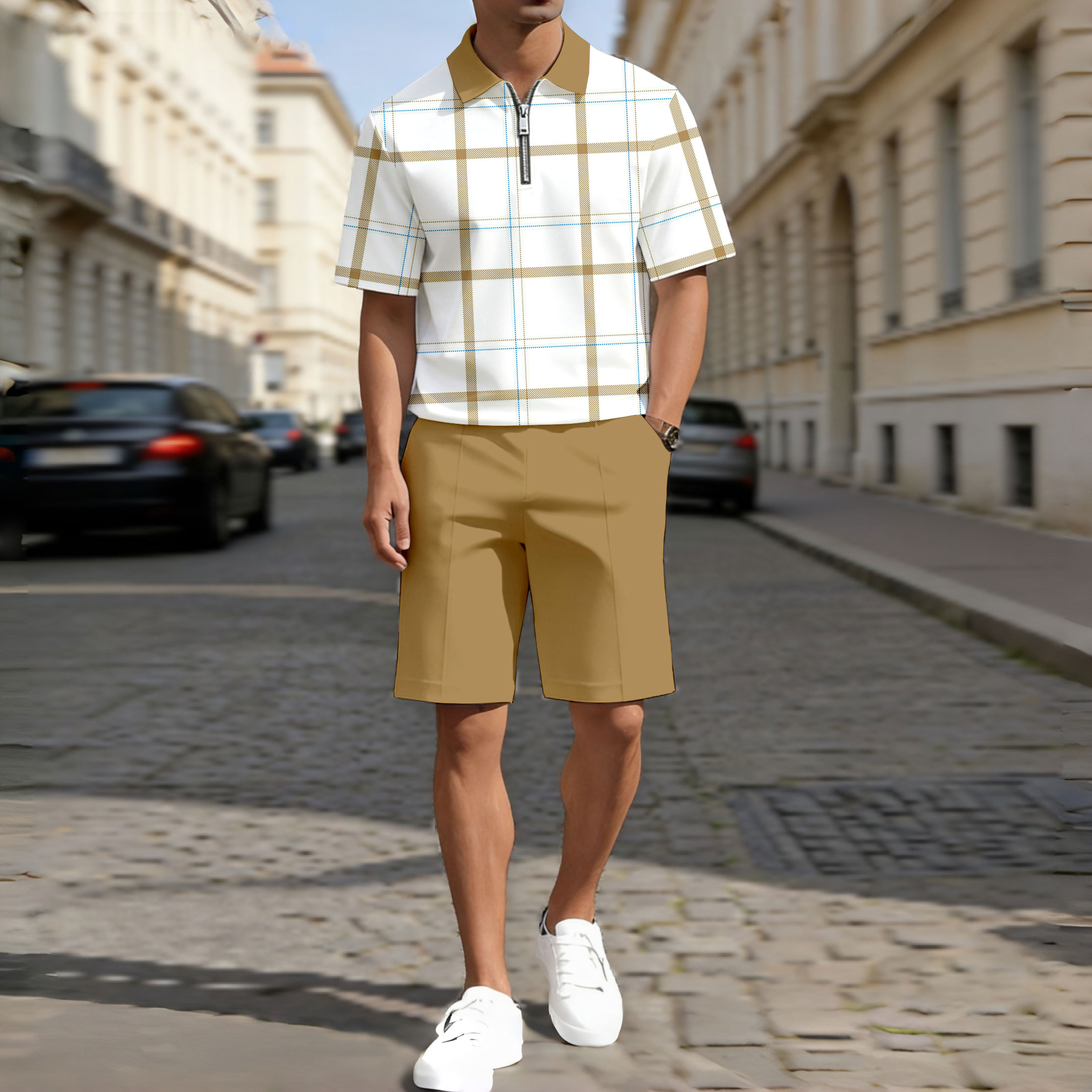 Men's Casual Tan & White Color Matching Checked Printed Zipper Short Sleeved Polo Shirt & Five-Point Pants Two-Piece Set