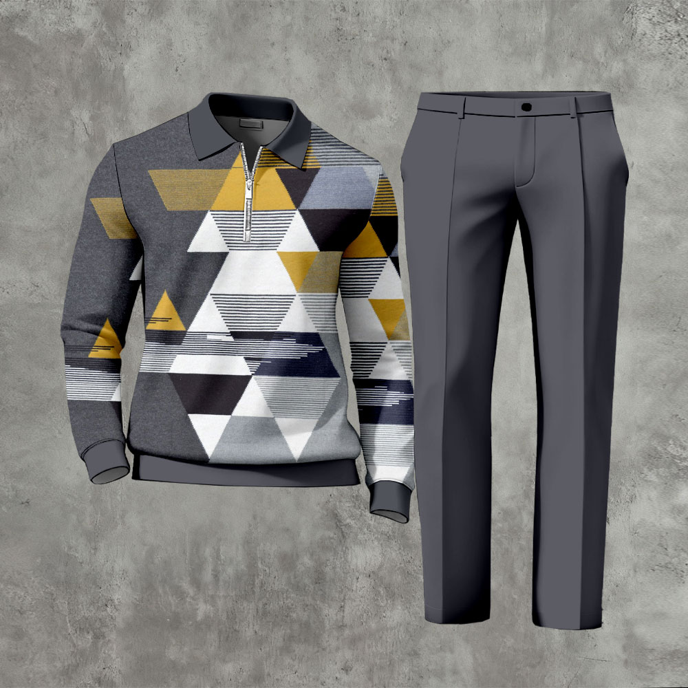 Men's Casual Triangle Geometric Print Polo Collar Zipper Long Sleeve Pants Two-Piece Set