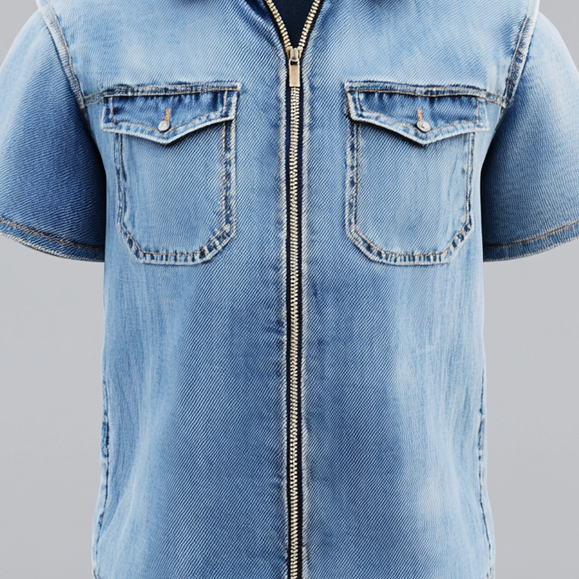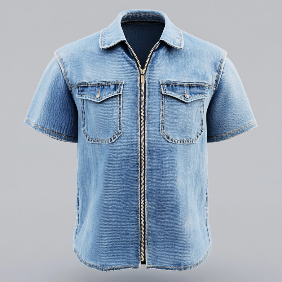 Men's Casual Turndown Collar Flap Pockets Short Sleeve Zip Up Denim Shirt