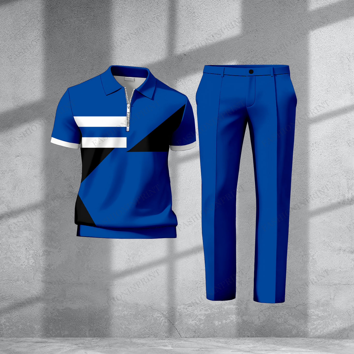 Men's Casual Royal Blue Geometric Two-Piece Set: Striped Short-Sleeve Top And Zip-Detail Trousers