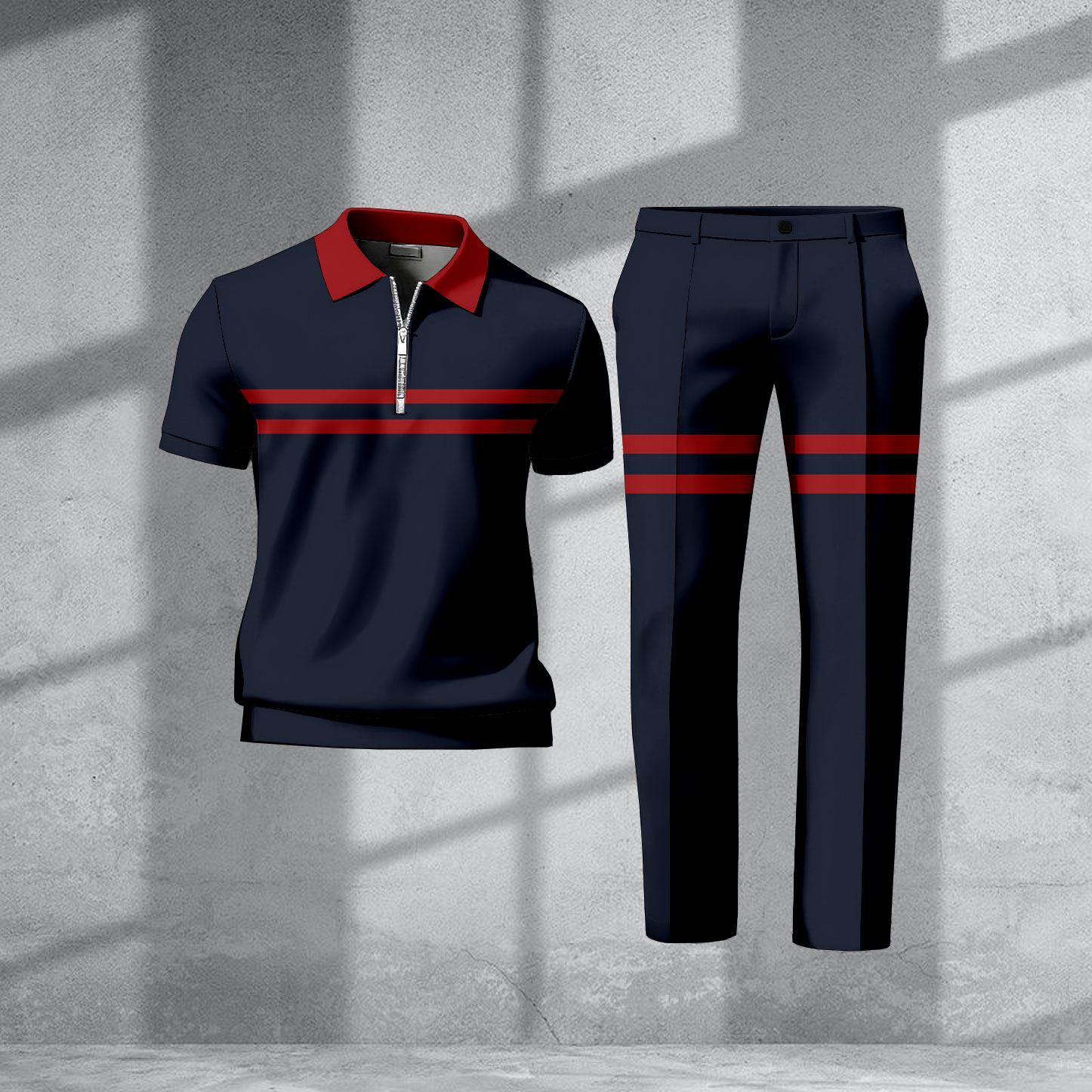 Men's Casual Two-Piece Set With Color Block Print Polo Collar Zipper Short-Sleeve T-Shirt And Pants