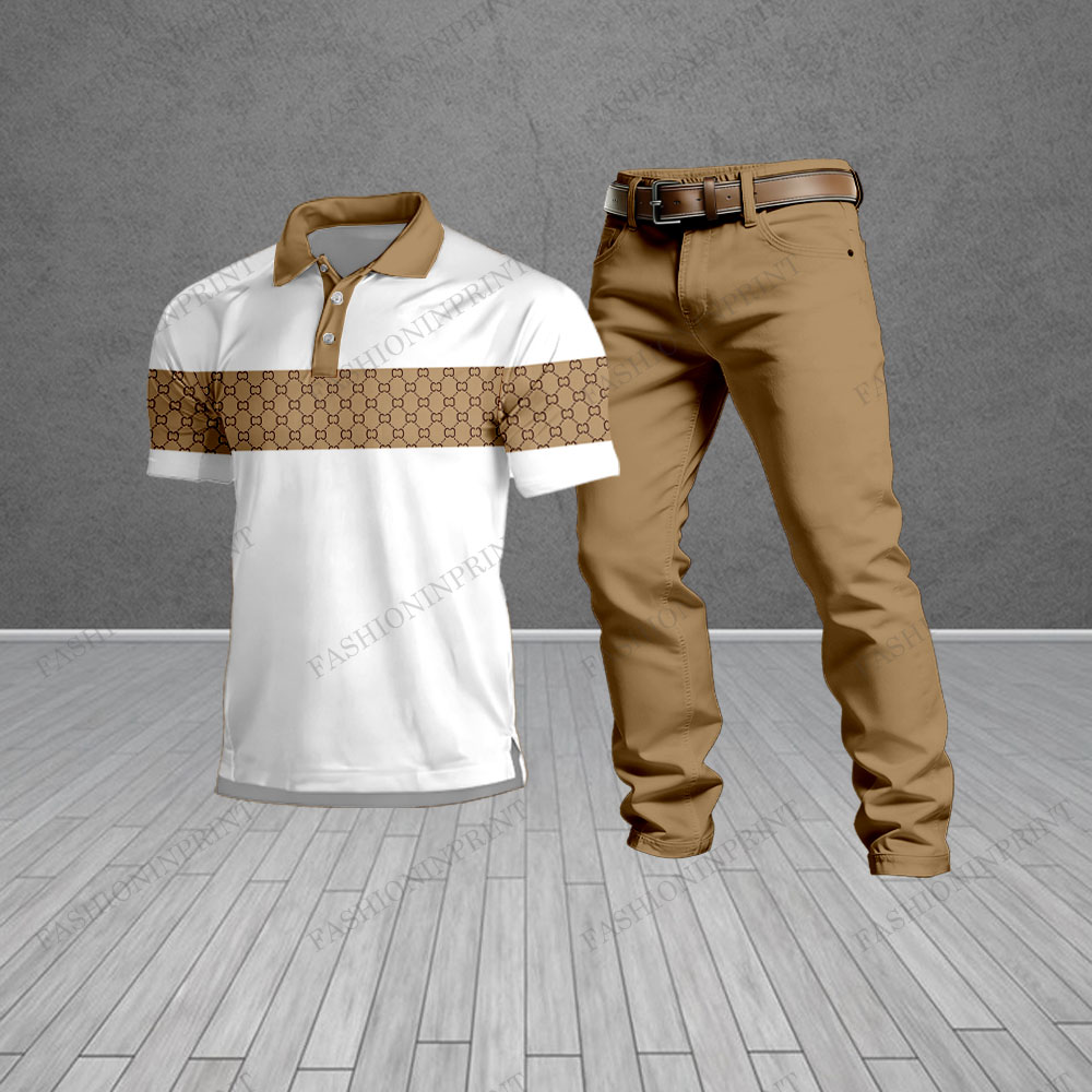 Men's Casual White & Brown Plaid Short-Sleeved Polo Shirt And Trousers Two-Piece Set