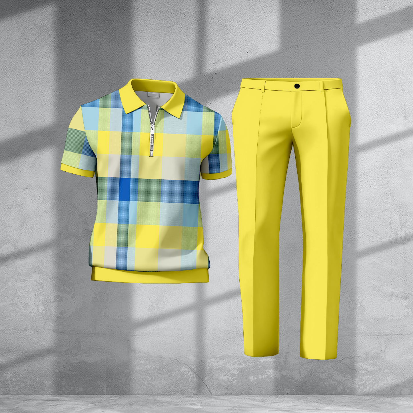 Men's Casual Yellow & Blue Color Matching Checkered Printed Short Sleeved Zipper Polo Shirt & Trousers Two-Piece Set