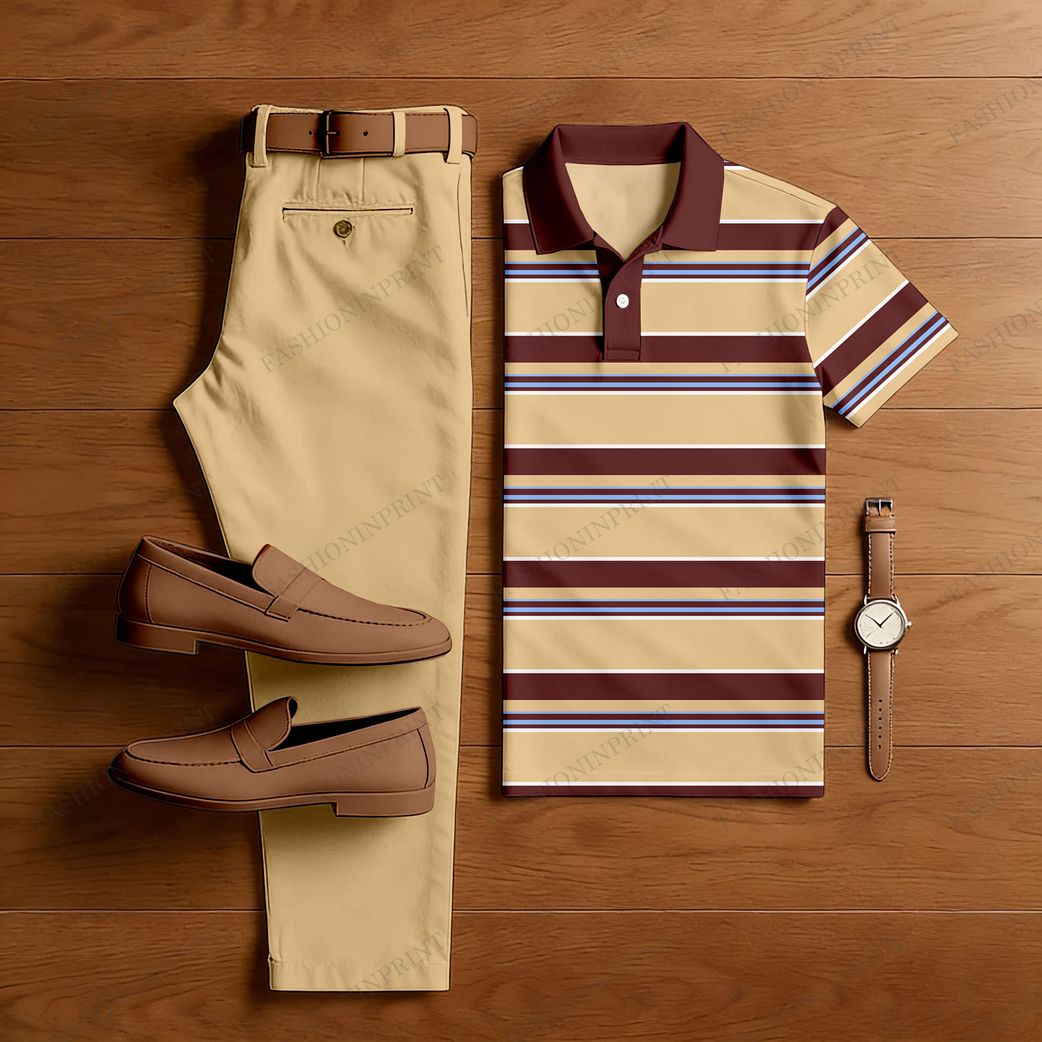 Men's Casual Yellow & Burgundy Color Matching Striped Printed Short Sleeved Polo Shirt & Trousers Two-Piece Set