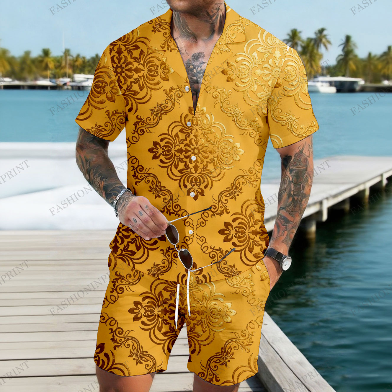 Men's Casual Yellow & Gold Color Matching Baroque Style Print Short-Sleeve Shirt & Shorts Two-Piece Set