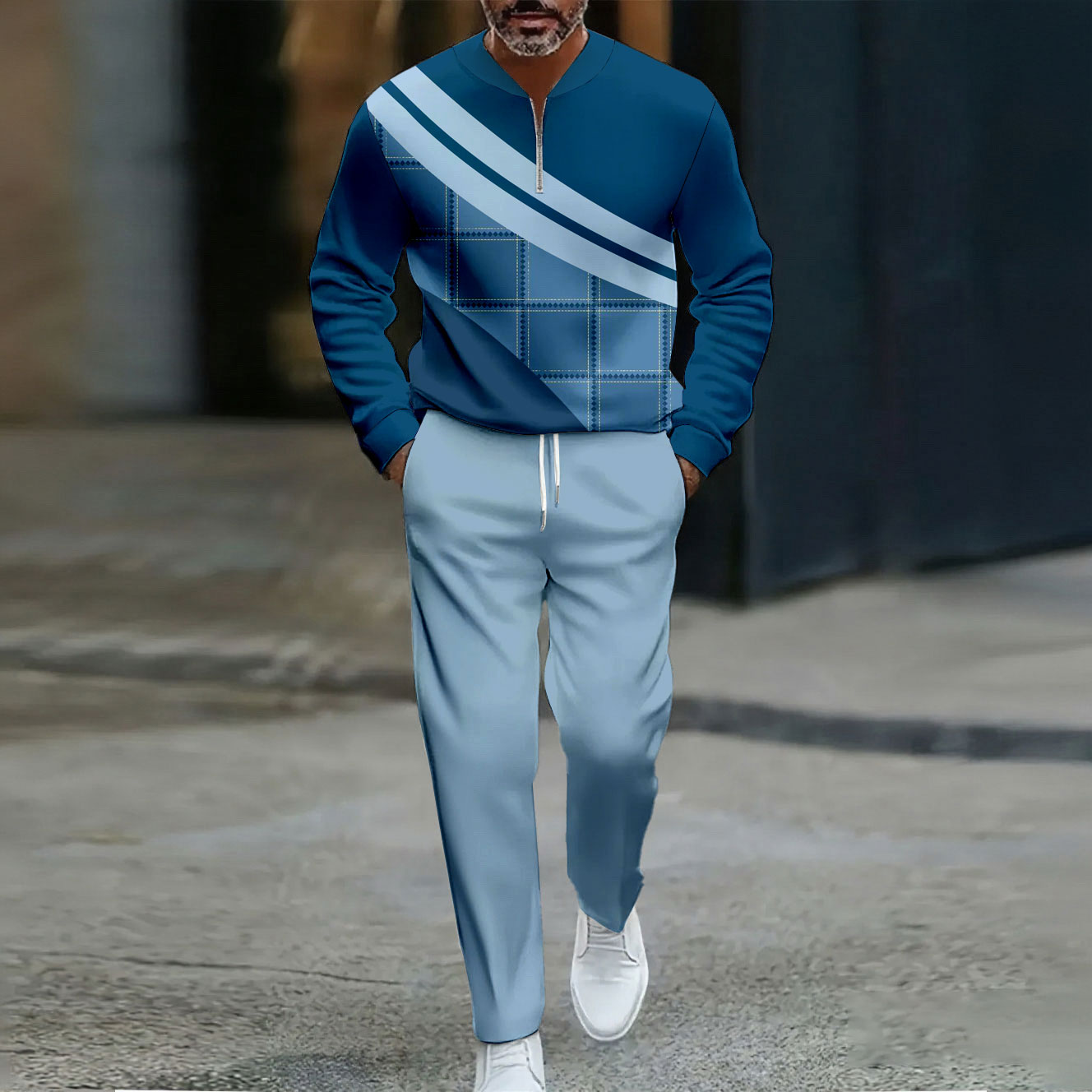 Men's Casual Color Matching Printed Polo-Collar Zipper Long Sleeved Trousers Two-Piece Set