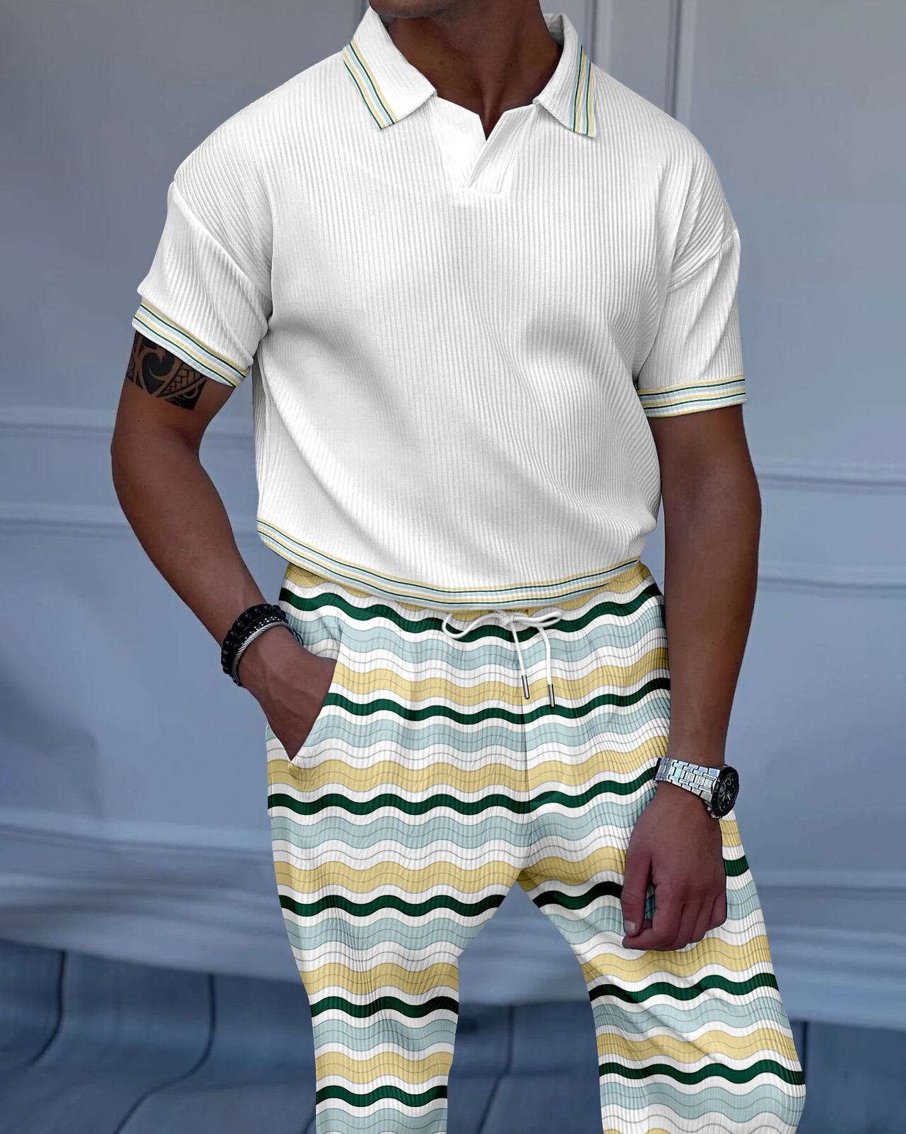 Men's Colorblock Casual Textured Polo Short Sleeve Suit - 006
