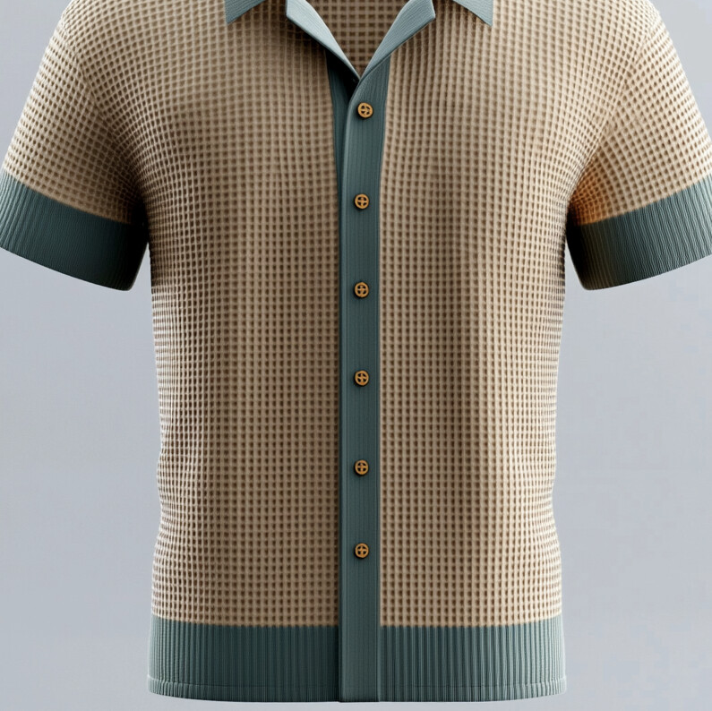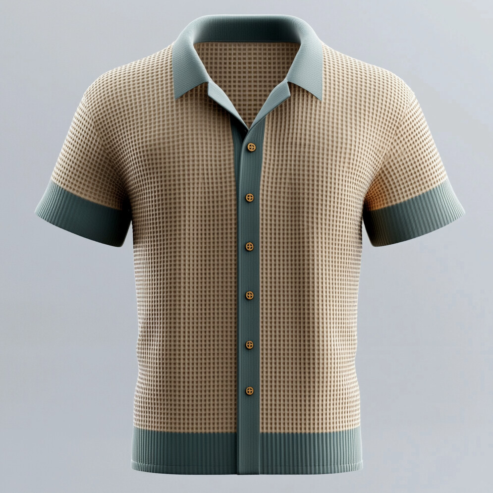 Men's Colorblock Textured Knit Camp Collar Short Sleeve Button Shirt