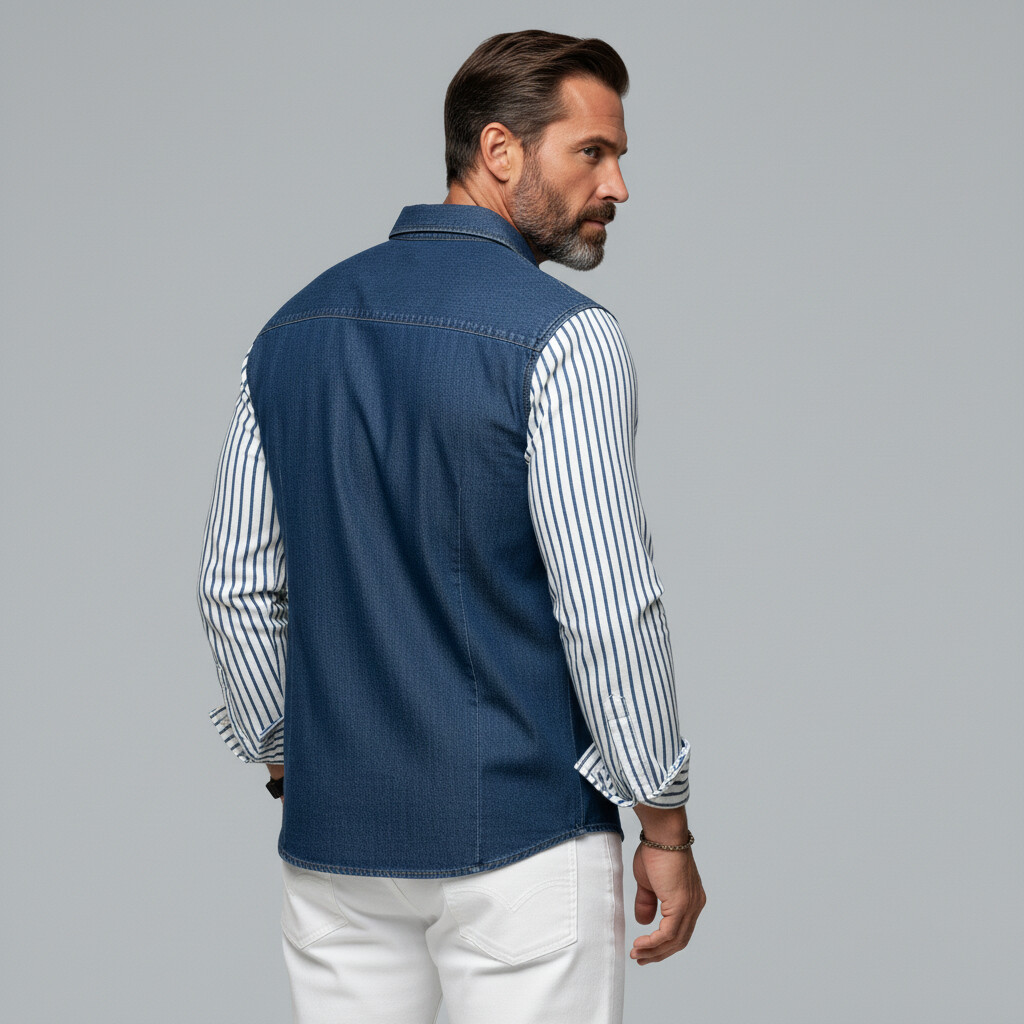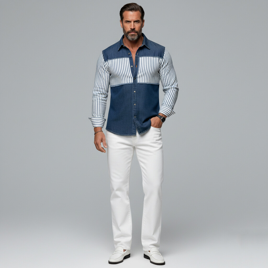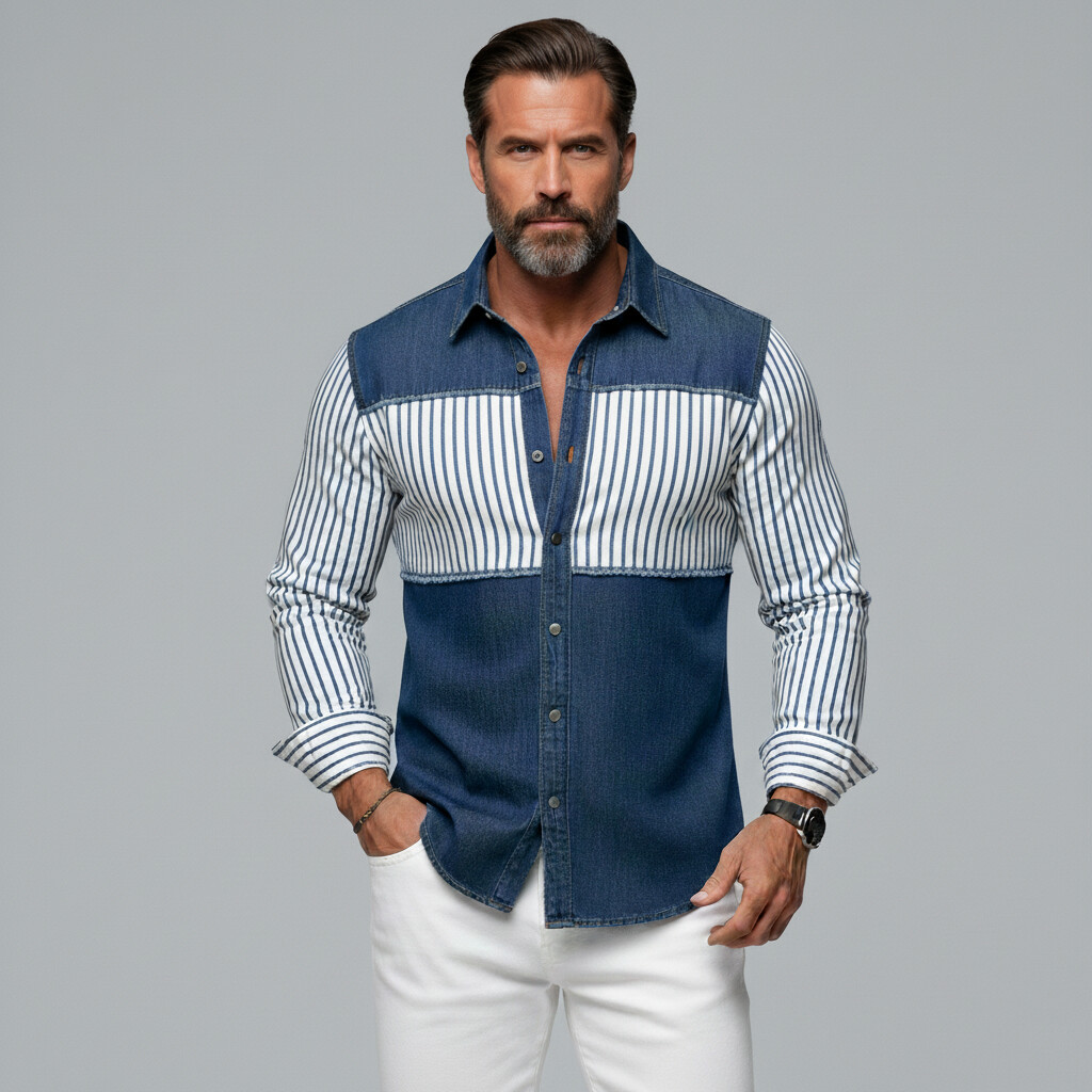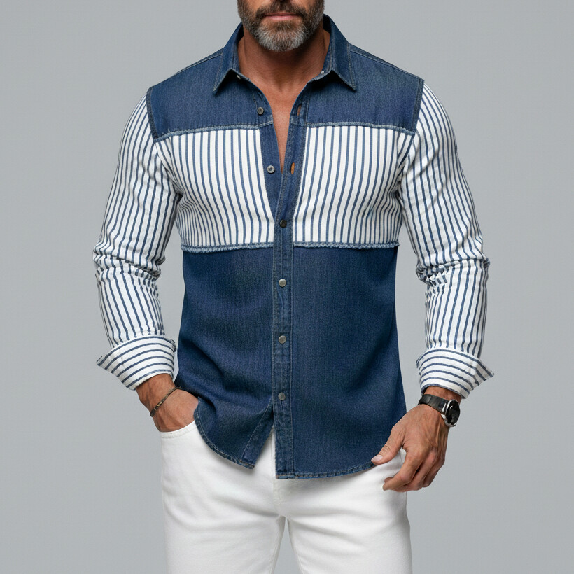 Men's Fashion Blue Striped Print Patchwork Raw Trim Denim Long Sleeve Shirt